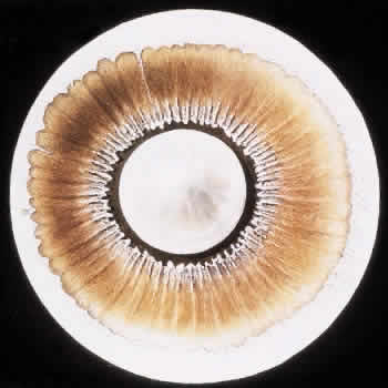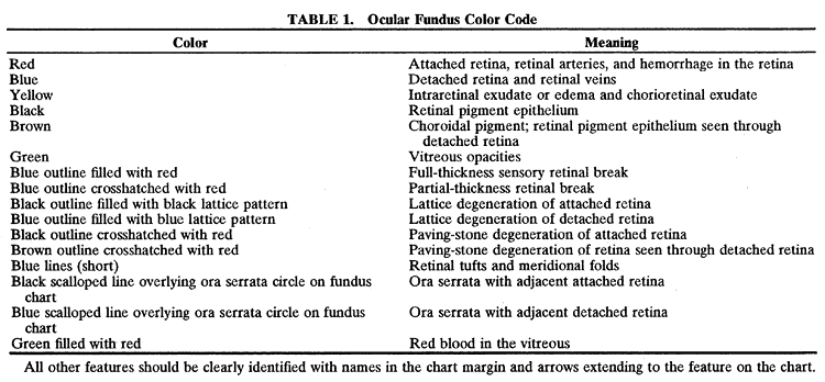 physician's observations are recorded on an ocular fundus chart (Fig. 1) using a standardized color code (Table 1).