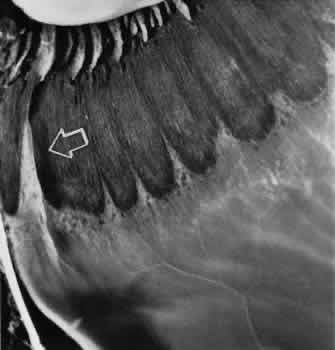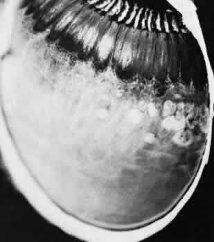 Full-thickness retinal tears unassociated with lattice degeneration, cystic retinal tuft, zonular-traction tuft, or other identifiable retinal abnor-mality are likely to occur at sites of exaggeratedparavascular vitreoretinal attachment and along the posterior border of the vitreous base. When posterior vitreous detachment occurs, full-thickness as well as partial-thickness tears may occur at one or more of these locations. On histologic examination, full-thickness retinal tears demonstrate vitreous attachment to the degenerated retinal flap or free operculum, gliosis and degeneration adjacent to the smooth, rounded margins of the tear, a variable degree of associated retinal detachment, and a combination of cell breakdown and hyperplasia in the underlying retinal pigment epithelium.27 Retinal breaks occur in about 13% to 14% of autopsy cases.40 Excluding retinal tears at the ora serrata and tears related to lattice degeneration or other identifiable disease processes, full-thickness retinal tears are found in 12% of adults at autopsy, are bilateral in 5% of affected adults, and are present in 7% of adult eyes (see Table 3). These lesions are most prevalent in the inferior temporal quadrant, are always located posterior to the vitreous base, and are universally associated with posterior vitreous detachment. Approximately half such full-thickness retinal tears are associated with at least a localized retinal detachment; this is especially likely to be present where the tear is located in the superior temporal or superior nasal quadrant. Clinical identification of full-thickness retinal tears is particularly significant. In the presence of posterior vitreous detachment, attention may be focused on abnormal retinal areas by a free operculum, projecting retinal flap, hemorrhage, or localized retinal pigment epithelium alteration.41 With or without these diagnostic clues, full-thickness retinal tears are visible on contact-lens biomicroscopy or on indirect ophthalmoscopy and scleral depression. As the scleral depressor creates translucency in the adjacent sensory retina, the tear is seen as a contrasting red area. A retinal tear and a retinal hemorrhage may be differentiated by the fact that the intensity of the contrasting red color of a tear varies with the position of the scleral depressor, but the red color of a retinal hemorrhage is unaffected by movement of the depressor. Full-thickness retinal tears should be carefully evaluated because these tears often warrant prophylactic therapy in an effort to prevent retinal detachment, and they require treatment when associated with rhegmatogenous retinal detachment. GENERALIZED RETINAL DISEASES Superimposed on normal morphology, developmental variations, and common degenerative processes of the peripheral retina is a wide array of diseases capable of affecting all parts of the retina. Among these diseases are developmental malformations (e.g., coloboma of the retina and choroid and familial hyaloidal vitreoretinopathies); vascular disorders (e.g., vasculitis and sickle cell diseases); metabolic diseases (e.g., diabetic retinopathy); infectious diseases (e.g., toxoplasma retinochoroiditis); neoplasms (e.g., retinoblastoma); degenerative disorders (e.g., retinitis pigmentosa); and traumatic disorders (e.g., traumatic retinitis and traumatic retinal dialysis). Pathologic features and clinical manifestations of these diseases are influenced by the specific anatomy of and relationships in the peripheral retina, the developmental variations, and the spectrum of degenerative changes that occur in the peripheral retina. |