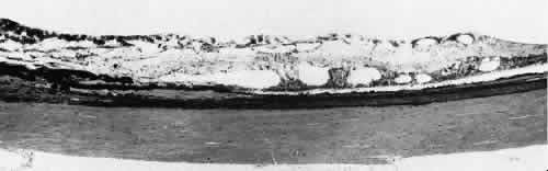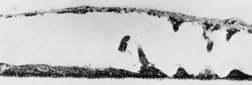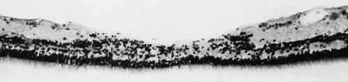 Paving-stone degeneration is associated with sharply circumscribed retinal thinning due to loss of the rods and cones and external limiting membrane, absence of the pigment epithelium, adherence of the retina to Bruch's membrane, and alteration of the choriocapillaris (Fig. 26). The hyperpigmented cuffs and septa consist of proliferated pigment epithelial cells. Paving-stone degeneration is present in 22% of adult patients, is bilateral in 38% of these, and thus is evident in 17% of adult eyes (see Table 3). Prevalence increases markedly with advancing age. In distribution, there is a preference for the inferior temporal and inferior nasal quadrants, with more than half of the lesions located in the inferior retina between the 5- and 7-o'clock positions. Lesions are most numerous immediately posterior to the ora serrata; they rarely extend posterior to the equator. Paving-stone degeneration does not predispose to retinal breaks or to retinal detachment and thus does not warrant any form of treatment. However, if a retinal detachment from some other cause involves an area of paving-stone degeneration, the retina may be torn at the site of the chorioretinal adherence. The resultant retinal breaks are often small, irregular in shape, inconspicuous, and best detected with contact lens biomicroscopy. PERIPHERAL TAPETOCHOROIDAL DEGENERATION With advancing age, the peripheral fundus usually develops a granular appearance, due to irregularity of the retinal pigment epithelium. Peripheral tapetochoroidal degeneration, a pronounced degree of this alteration, presents as a diffusely depigmented circumferential band that extends from the ora serrata to the equator. The anterior border is irregular because of splotchy pigmentation that remains within the area of the vitreous base, but the posterior border is usually smooth and well defined.11 Peripheral tapetochoroidal degeneration is associated with degeneration and loss of pigment granules in the retinal pigment epithelium, some loss of photoreceptor cells, diffuse thickening of Bruch's membrane, and a diminution of capillaries in the choriocapillaris. Although minor degrees of degeneration of the retinal pigment epithelium are common in older patients, extensive alterations that meet the criteria of peripheral tapetochoroidal degeneration are present in 20% of patients over 40 years of age, are bilateral in all cases, and thus are present in 20% of eyes in this group (see Table 3). This age-related process does not predispose to retinal tear formation and requires no treatment. RETINAL HOLE Most retinal holes (76%) are secondary to lattice degeneration.20 Primary retinal holes, unrelated to lattice degeneration or other identifiable disorders, are rounded, full-thickness retinal breaks without a flap or a free operculum (Fig. 27). Usually located anteriorly within the area of the vitreous base, the holes have smooth margins; the adjacent retina usually appears normal; proliferative reactions are absent; and vitreous attachments are not unusual.11 Microsections of retinal holes confirm the complete retinal discontinuity and the smooth, rounded margins (Fig. 28). There is minimal reactive gliosis; no significant alteration is found in the adjacent vitreous body or in the pigment epithelium.