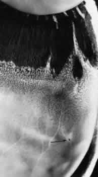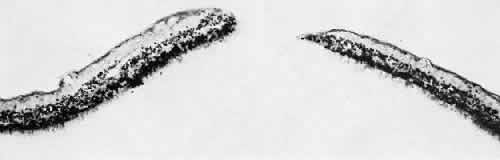 Related to vitreous traction as well as to the overall stage, area, and anteroposterior location of the lattice degeneration is the tendency for tears to form along the posterior margin or end of the lesion where vitreous separation from the retina occurs. The tear, almost always associated with posterior vitreous detachment, assumes a linear form if it extends along the posterior margin, an L shape if there is anterior extension at one end, and a U shape if there is anterior extension at both ends (Fig. 33). Tears may be single or multiple and small or very large and may occur with or without associated rhegmatogenous retinal detachment.