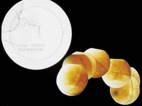 TYPICAL CYSTOID DEGENERATION The most common form of degeneration of the peripheral retina is typical cystoid degeneration. Spaces develop in the outer plexiform and inner nuclear layers and coalesce to form interlacing tunnels; they are separated by pillars that extend from the inner to the outer retinal layers, giving the inner surface a uniformly stippled appearance (Fig. 15). The stippled depressions correspond to retinal pillars; the intervening rounded domes result from the intraretinal cystoid spaces.9 Degeneration begins at the ora serrata, particularly at the base of dentate processes, and extends posteriorly and circumferentially to form a band that may encircle the eye and reach from the ora serrata to the equator (Fig. 16). This degenerative process may be noted in infants at 1 year of age; it is always present in both eyes of patients over 8 years of age, usually increases in area with advancing age, and is most extensive in the superior and temporal quadrants (see Table 3).10,11 RETICULAR CYSTOID DEGENERATION Reticular cystoid degeneration of the peripheral retina is almost invariably located posterior to and continuous with typical cystoid degeneration. It is characterized by a prominent linear or reticular pattern that corresponds to the retinal vessels and by a finely stippled internal surface. Areas of involvement are single or multiple, form the shape of an irregular angle, and are often demarcated posteriorly by retinal blood vessels (see Fig. 16).12 Spaces develop in the nerve fiber layer and are divided by delicate retinal pillars (see Fig. 15). Reticular cystoid degeneration is present in 18% of adult patients, is bilateral in 41% of affected patients, and is thus evident in 13% of all adult eyes (see Table 3). The process is most prevalent in the inferior temporal quadrant.13 Clinically reticular cystoid degeneration is detected on contact lens biomicroscopy by noting the location, shape, prominent reticular pattern, and finely stippled appearance of the affected area. DEGENERATIVE RETINOSCHISIS Degenerative retinoschisis, a more extensive trophic process, presents as a round or ovoid area of retinal splitting with a smooth fusiform elevation of the inner layer (Fig. 17). The schisis is surrounded on all sides by typical cystoid degeneration; the retinal pillars of the cystoid degeneration as well as the broken pillars near the margin of the schists are prominent. Vessels are located in the inner retinal layer, the intraretinal cavity is optically empty, and the outer retinal layer is moderately irregular in contour.13,14 In one type of degenerative retinoschisis, the thin inner wall is composed of the internal limiting membrane, the nerve fiber layer, and retinal vessels (Fig. 18). The irregular outer wall contains portions of the inner nuclear, outer plexiform, outer nuclear, external limiting, and rod and cone layers. At the margin of the cavity, the retinoschisis blends with typical cystoid degeneration and may be relatively flat. Lesions with this appearance have been termed typical degenerative retinoschisis. Typical degenerative retinoschisis is present in 1% of adult patients and is bilateral in 33% of these patients; therefore, it is evident in 0.7% of adult eyes (see Table 3), with a predilection for location in the inferior temporal quadrant. A narrow band of typical cystoid degeneration is always present between the ora serrata and the anterior border of the schisis cavity; the involved area may extend to or somewhat posterior to the equator. On clinical examination, typical degenerative retinoschisis appears as round or ovoid areas of retinal splitting with fusiform elevation of the inner layer (Fig. 19). The stippled pattern of surrounding typical cystoid degeneration extends on the inner layer for a variable distance; centrally the inner layer, which contains the blood vessels, is thin and smooth. On contact lens ophthalmoscopy, the inner layer is finely textured, some of the retinal vessels are attenuated, and there is a variable number of tiny, glistening, white dot opacities on the vitreous side. The outer layer, found external to the optically empty cavity, is best seen with indirect ophthalmoscopy when it becomes white on scleral depression. It is somewhat uneven, giving an appearance of finely hammered or beaten metal. Typical degenerative retinoschisis does not extend posteriorly to threaten the macula, and it is not often associated with breaks in either retinal layer; it rarely requires treatment. Retinoschisis associated with a bullous architecture and prominent reticular cystoid degeneration has been termed reticular degenerative retinoschisis. Reticular degenerative retinoschisis can be distinguished from typical degenerative retinoschisis by the large extent of retinal involvement, a round or ovoid configuration with bullous elevation of the extremely thin inner layer, and an irregular, pitted outer layer (Figs. 20 and 21). Typical cystoid degeneration is always present anterior to the schisis; reticular cystoid degeneration is usually prominent at some site in the involved eye. Blood vessels coursing through the inner layer give it an arborizing reticular pattern on contact lens biomicroscopy. The intraretinal cavity is optically empty; the outer wall is irregularly excavated to produce a pocked or honeycomb appearance. Round or ovoid holes are often present in the outer retinal layer; they are single or multiple, frequently large, and usually associated with a rolled posterior edge.13 Microscopic sections demonstrate the extremely attenuated, blood vessel-containing inner layer composed of the internal limiting membrane and remnants of the nerve fiber layer (Fig. 22). The honeycomb appearance of the outer layer corresponds to irregular excavations. In some areas, the outer layer is made up of outer plexiform, outer nuclear, external limiting, and rod and cone layers; in other areas it is reduced to only the external limiting and the r