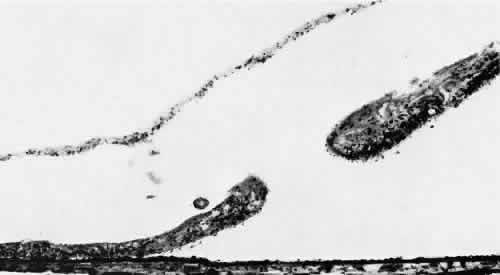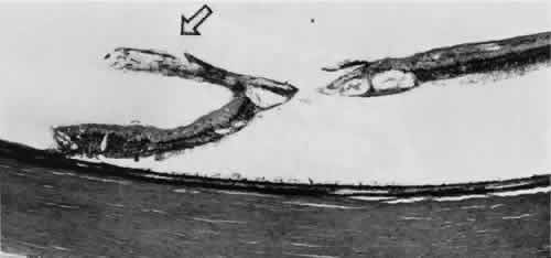 Cystic retinal tufts are present at birth; they are evident in 5% of adults, are bilateral in 6% of affected patients, and thus are detected in 2.5% of adult eyes (see Table 3). Although cystic retinal tufts show no quadrant predilection, 78% occur in the equatorial (extrabasal) zone, and 80% occur singly in eyes of affected patients. On clinical examination, cystic retinal tufts are readily visualized and are distinguishable from noncystic tufts by size and other characteristics. Cystic retinal tufts are of importance because they may be avulsed by vitreous traction, with or without posterior vitreous detachment leading to retinal tear or retinal detachment. Of patients with retinal detachment, an avulsed cystic retinal tuft is implicated in up to 7% of eyes. However, of all patients with a cystic retinal tuft, only 0.18% would develop retinal detachment due to this lesion. As such, prophylactic laser photo-coagulation for cystic retinal tuft is not recommended.35 ZONULAR-TRACTION RETINAL TUFT The zonular-traction retinal tuft always projects from the retinal surface internally and anteriorly toward the zonule (Fig. 40). Usually single and located within the vitreous base, zonular-traction retinal tufts are joined to zonular fibers at the apex; the tufts, which vary in length and thickness, are associated with a broad range of trophic and tractional alterations at the retinal end of the process. Histopathologic changes include zonular attachments at the apex, neuroglial cells within the tuft, and degeneration with retinal thinning at the base (Fig. 41). Retinal holes and tears result from the combination of trophic changes at the base and traction resulting from zonular fibers. Within the vitreous base and posterior to it, zonular-traction tufts may be associated with partial-thickness or full-thickness retinal tears that can occur in the absence of posterior vitreous detachment. Zonular-traction tufts are present at birth and detected with equal frequency in patients of all ages; they are noted in 15% of patients, are bilateral in 15% of affected people, and thus are evident in 9% of all eyes (see Table 3). These tufts are most common in the nasal quadrants, usually attached to the retina less than 0.5 mm posterior to the ora serrata and only infrequently attached to the retina posterior to the vitreous base.27,36 Clinical examination of the peripheral fundus reveals zonular-traction tufts in patients of all ages. These lesions are distinguished from noncystic and cystic retinal tufts by their greater size, sharp anterior angulation, and close proximity to the ora serrata. Zonular-traction tufts are a significant cause of small, round retinal holes in the extreme periphery of the retina. Although retinal holes within the vitreous base are considerably less likely to produce retinal detachment than holes posterior to the vitreous base, surgical aphakia or pseudophakia, which necessarily involves some form of zonular traction, is associated with an increase in the frequency of retinal detachment, which is likely to be related to small retinal breaks in the nasal periphery.36,37 PARTIAL-THICKNESS RETINAL TEAR A partial-thickness retinal tear involves the inner layers of the retina and results in a thin flap or free operculum.38 Partial-thickness retinal tears are usually multiple and are classified into two types by distribution: paravascular tears occurring adjacent to peripheral retinal vessels and vitreous base tears aligned circumferentially along a segment of the posterior border of the vitreous base. Both forms, which sometimes exist concurrently in the same eye, reflect anatomic features and mechanisms that are of practical importance in ophthalmology. Paravascular partial-thickness retinal tears stem from exaggerated vitreoretinal attachments at and immediately adjacent to peripheral arterioles and venules. These relatively firm attachments often produce multiple, discrete foci of cystic degeneration adjacent to peripheral retinal vessels. When posterior vitreous detachment occurs, the inner retinal layers at these foci of paravascular rarefaction remain attached to the vitreous, and clusters of partial-thickness retinal tears are formed. After this avulsion, microscopic studies of the retina show focal absence of the internal limiting membrane and absence of varying amounts of the inner retinal layers.39 Paravascular partial-thickness retinal tears occur in 17% of adults, are bilateral in 27% of affected patients, and thus are present in 11% of adult eyes (see Table 3). Posterior vitreous detachment is present in 100% of affected eyes. The superior quadrant is the area most commonly involved, and the tears are always located posterior to the vitreous base. On clinical examination by contact lens biomicroscopy, paravasealar retinal rarefaction is seen as a subtle irregularity of the retina adjacent to the peripheral retinal vessels. Paravascular partial-thickness retinal tears are visible as small, usually multiple retinal craters adjacent to peripheral retinal vessels. These tears assume substantial clinical significance because of the occasional association with retinal vessel avulsion and the frequent association with partial-thickness vitreous base tears and full-thickness peripheral retinal tears. Partial-thickness retinal tears also develop in association with posterior vitreous detachment as multiple flap tears aligned circumferentially along a segment of the posterior border of the vitreous base. Inner retinal layers are partially avulsed and attached to the detached vitreous body.27 Partial-thickness retinal tears at the posterior border of the vitreous base are present in 12% of adults, are bilateral in 5% of affected patients, and thus are noted in 7% of adult eyes (see Table 3). The process is equally prevalent in all quadrants, is always located at the posterior margin of the vitreous base, and is invariably associated with posterior vitreous detachment. On clinical e