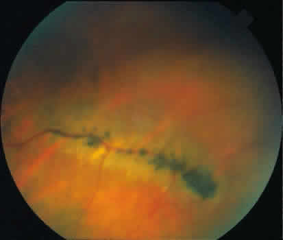 Early stages of lattice degeneration have the characteristic spindle shape and circumferential orientation, but in general they are relatively narrow with a troughlike central retinal thinning; variable, round, punched-out areas of extreme retinal thinning; typical vitreous alterations; retinal blood vessels that appear normal; and mild pigment alterations (Fig. 31). Advanced stages of lattice degeneration may retain the characteristic shape and orientation but tend to be somewhat wider with a greater degree of overall retinal thinning, of arborizing white lines that are often continuous with blood vessels, and of conspicuous retinal pigment alterations. In addition, round or oval areas of extreme retinal thinning or holes are more common, liquefaction in the overlying vitreous is greater, and vitreoretinal attachments at the margin of the process are more pronounced.