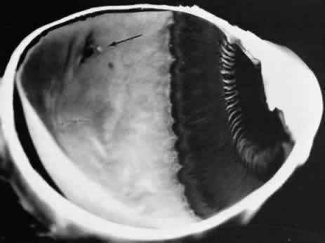 MERIDIONAL COMPLEX A meridional complex is the occurrence of a dentate process and a ciliary process within the same meridian. When this abnormal alignment occurs, the den-tate process is exceptionally large, usually combined with a meridional fold, usually continuous with an enlarged ciliary process, and often associated with peripheral retinal excavation in the corresponding meridian (Fig. 9). The large dentate process and meridional fold are composed of excessive, disorganized, somewhat degenerated retinal tissue (Fig. 10). Meridional complexes are present in 16% of the population, are bilateral in 58% of affected patients, and thus are present in 12% of all eyes (see Table 2). The complexes are multiple in 45% of the affected eyes; they are most common in the superior nasal quadrant. ENCLOSED ORA BAY Enclosed and partially enclosed ora bays are relatively uncommon developmental variations. These are oval islands of pars plana epithelium located immediately posterior to the ora serrata and com-pletely or almost completely circumscribed by the peripheral retina (Figs. 11 and 12). The enclosed ora bay is composed of a thin layer of nonpigmented pars plana epithelium surrounded by neurosensory retina. Enclosed and partially enclosed ora bays are evident in 6% of patients, are bilateral in 8% of affected individuals, and are present in 3% of all eyes (see Table 2). These lesions are equally prevalent nasally and temporally near the horizontal meridian.6,7 PERIPHERAL RETINAL EXCAVATION Peripheral retinal excavation appears as a rather small oval depression in the retina. Usually this lesion is aligned meridionally with a meridional fold or complex and located 1 to 7.2 mm posterior to the ora serrata (Fig. 13; see Figs. 6 and 12). The focal depression may be surrounded by margins that appear to be elevated; however, microscopic examination reveals that the depression corresponds to afocal loss of the inner retinal layers and that the surrounding tissue is normal (Fig. 14). Peripheral retinal excavation is present in 10% of patients, is bilateral in 43%, and therefore is evident in 8% of all eyes (see Table 2). Half of the affected eyes contain two or more areas of focal excavation, and most of the excavations are located in the superior nasal quadrant. Developmental variations of the peripheral retina are present in about 20% of eyes. These conditions have certain common features: they are present at birth, persist throughout life, tend to occur symmetrically in anatomically corresponding positions in both eyes, and are commonly associated with an abnormal alignment of a dentate and a ciliary process in the same meridian.5 Clinically, these developmental abnormalities are readily identified in the peripheral retina. The ridgelike elevation of a meridional fold is best seen by scleral depression combined with indirect ophthalmoscopy. A meridional complex should be suspected (even though the ciliary processes are not visible) when a large dentate process, a meridional fold, and peripheral retinal excavation occur in the same meridian. An enclosed ora bay appears as a depressed, bright red area that simulates a retinal hole. Although identification of an enclosed ora bay is aided by a thin epithelial layer extending across the base and by the absence of any elevation of the surrounding retina, in some instances, distinction between an enclosed bay and a retinal hole is impossible. Peripheral retinal excavation presents as a small retinal pit that may be adjacent to or up to 4 disc diameters posterior to the ora serrata. This form of focal depression probably has been often mistaken for a full-thickness retinal break; therefore, knowledge of developmental variations is essential to the appropriate diagnosis of a peripheral retinal lesion. In clinical studies, retinal breaks posterior to meridional folds have been noted in a number of eyes with rhegmatogenous retinal detachment.8 Retinal tears may also develop at or near the posterior margins of enclosed ora bays.7 Therefore, when retinal detachment is present, the ophthalmologist must carefully search for meridional folds, meridionalcomplexes, enclosed ora bays, peripheral retinal excavations, and any associated retinal breaks. TROPHIC PERIPHERAL RETINAL DEGENERATIONS Various specific peripheral retinal degenerations augment these developmental variations. Degeneration (i.e., irreversible retrograde change) is evident in the peripheral retina of every adult. For classification, this degeneration may be regarded as trophic when the primary process is a loss of retinal tissue, tractional when the process is related primarily to tugging or pulling of vitreous or zonule on the retina, and trophic and tractional when both retinal tissue loss and vitreous-zonule traction are involved. The principal peripheral retinal degenerations are noted in Table 3.