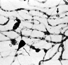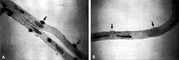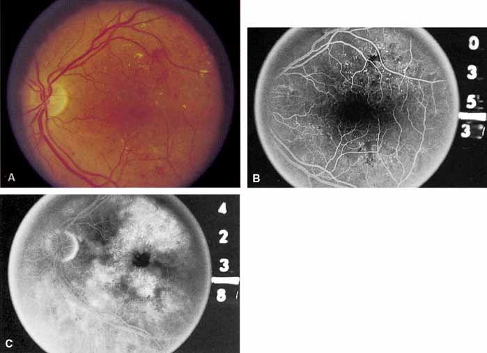 If the leakage of fluid is severe enough, lipid may accumulate in the retina (see Figs. 4 and 5). Again, the outer plexiform layer is first to be affected. In some cases, lipid is scattered through the macula, in others, it accumulates in a ring around a group of leaking microaneurysms, or around areas of capillary nonperfusion (see Figs. 4 and 5). This pattern is called circinate retinopathy. In addition to the retinal vascular abnormalities, the choriocapillaris may be involved in NPDR. Initially there is a thickening of the basement membrane.8 Later, a periodic acid-Schiff (PAS)–positive material accumulates, which impinges on and may occlude the lumen of the choroidal capillaries in the posterior pole.4 ADVANCED NONPROLIFERATIVE DIABETIC RETINOPATHY In advanced NPDR, signs of increasing retinal hypoxia appear, including multiple retinal hemorrhages, cotton-wool spots (Fig. 7), venous beading and loops (Figs. 7 and 8), intraretinal microvascular abnormalities (IRMA) (see Figs. 7 and 8), and large areas of capillary nonperfusion.