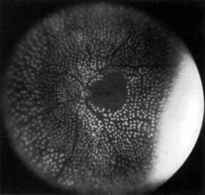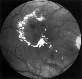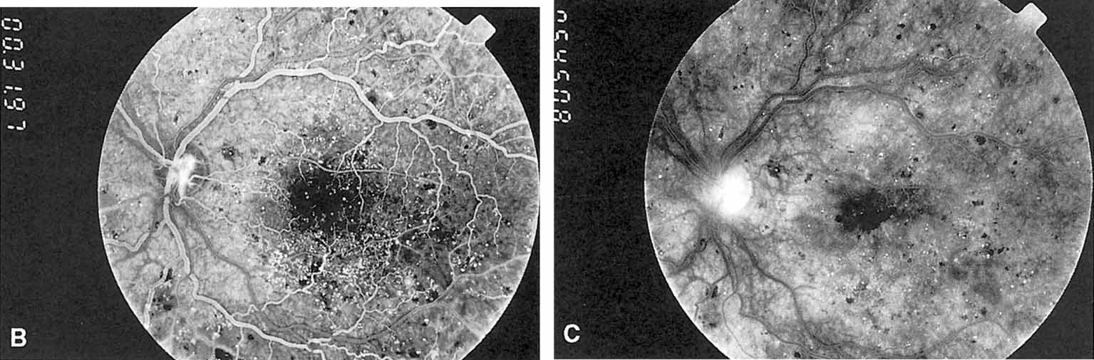 To prevent new areas of neovascularization, several ophthalmologists began to photocoagulate not only neovascularization but all intraretinal hemorrhages as well (“shoot the red”), on the grounds that they represented areas of hypoxia that could later develop into proliferative retinopathy. They soon noted that the cases that had the most intraretinal hemorrhages and therefore received the most initial photocoagulation frequently had the best long-term results, with permanent regression of neovascularization (Fig. 20). In such cases, the optic disc often became pale, indicating optic atrophy.