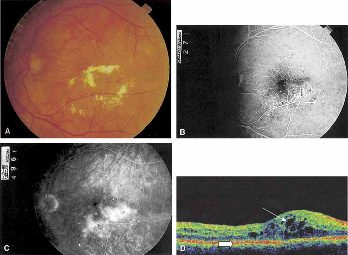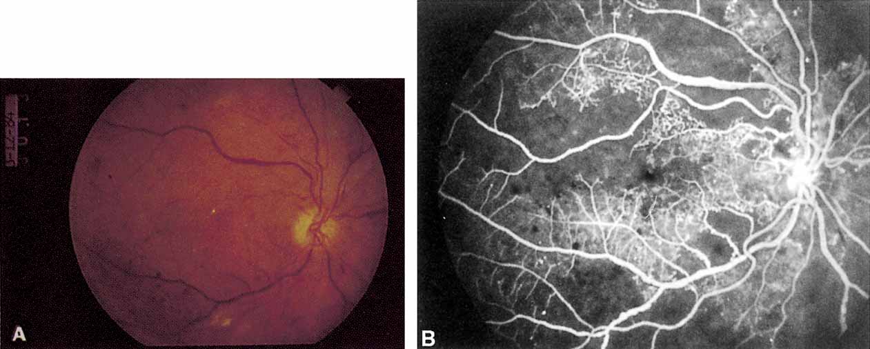 In patients who have recurrent vitreous hemorrhage after vitrectomy, a simple outpatient air/liquid exchange may restore vision without the need for a repeat vitrectomy.209 Traction retinal detachments are usually a much greater challenge. In general, unless the macula becomes involved, observation is the best therapy for these patients because, in most cases, the detachment will not progress into the macula.210 These patients should be counseled to consult their ophthalmologist without delay should macular vision be suddenly lost, because vitrectomy at that point becomes a relative emergency.202 The surgical objectives are to clear the media, to release all anterior–posterior traction, to release tangential traction by cutting bridges between areas of traction detachment or by delamination, and to perform endophotocoagulation to prevent neovascularization of the iris. The prognosis is best in patients with small areas of traction. An alternative technique is to remove the vitreous and preretinal membranes by the “en bloc” technique.211,212 The prognosis is poorest in eyes with extensive fibrous adhesion to the retina (table-top) detachments, significant preoperative vitreous hemorrhage, no prior PRP, and advanced fibrovascular proliferation. If a lensectomy is required and if iatrogenic breaks are created, the results are also poorer. 202–208,210 Approximately 60% to 70% of patients have increased visual acuity and a final visual acuity of 20/800 or better, but 20% to 35% have decreased vision after surgery. Cases with severe peripheral fibrovascular proliferation may also require a scleral buckling procedure.219 Reoperations are required in approximately 10% of patients, most commonly the repair of rhegmatogenous retinal detachment or for clearing of recurrent vitreous hemorrhage.220 In traction/rhegmatogenous retinal detachments, the objectives are to find all of the retinal breaks and to release all vitreous traction. After air/fluid exchange to flatten the retina, endolaser photocoagulation is used to treat retinal breaks. Approximately one-half of such detachments can be cured.221,222 In severe cases, silicone oil is required to reattach the retina.223–225 Neovascularization of the iris (NVI) that progresses to neovascular glaucoma is a common cause of failure following otherwise successful vitrectomy. The risk is higher if there is preoperative neovascularization of the iris (17% versus 33%) if there is persistent retinal detachment after surgery, if the lens is removed during surgery, and if there is florid NVD and NVE. In eyes without these factors, the incidence of neovascular glaucoma is only about 2%.226 The pathogenesis of this complication is unknown. Some investigators feel that removal of the vitreous allows vasoproliferative factors produced in hypoxic retina to diffuse forward to the iris. Others feel that the main problem is that oxygen diffuses posteriorly from the anterior chamber lowering its oxygen tension too far. Fortunately, if an eye does not develop rubeosis iridis in the first 4 to 6 months after vitrectomy, it rarely will do so later. Another vision-threatening complication is neovascularization originating from the anterior retina and extending along the anterior hyaloid to the posterior lens surface (anterior hyaloidal fibrovascular proliferation).227 |