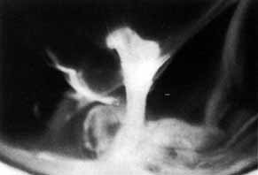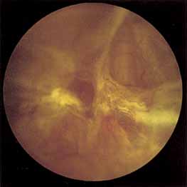 In combined traction/rhegmatogenous detachment, the borders of the elevated retina usually extend to the ora serrata; the retinal surface is dull and grayish and undulates because of retinal mobility caused by shifting subretinal fluid. The causative retinal breaks are usually found in the posterior pole near areas of fibrovascular proliferation. They are oval in shape and appear to be partly the result of tangential traction from the proliferative tissue as well as vitreous traction. Determining the location of retinal holes may be complicated by many factors, particularly poor dilation of the pupil, lens opacity, increased vitreous turbidity, vitreous hemorrhage, intraretinal hemorrhage, and obscuration of the breaks by overlying proliferative tissue. Often they are only located during vitrectomy surgery. |