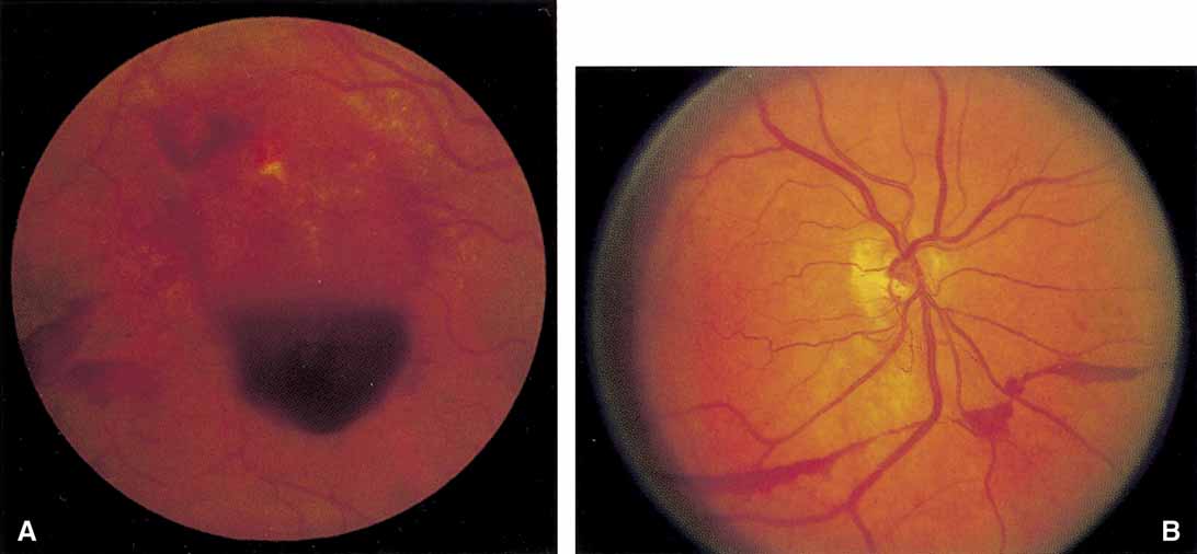 Although the macular edema, exudates, and capillary occlusions seen in NPDR often cause legal blindness, affected patients usually maintain at least ambulatory vision. PDR, on the other hand, often results in severe vitreous hemorrhage or retinal detachment with hand-movements vision or worse. It has long been assumed that sudden vitreous contractions tear the fragile new vessels, causing vitreous hemorrhage. However, 62% to 83% of diabetic vitreous hemorrhages occur during sleep,16,17 possibly because of an increase in blood pressure secondary to early morning hypoglycemia or to rapid eye movement (REM) sleep. Because so few hemorrhages occur during exercise, we do not restrict the activity of patients with proliferative retinopathy. The location of the hemorrhage is important in predicting whether it will clear on its own. If blood is behind the posterior vitreous face it is likely to settle to the bottom of the eye and be absorbed. However, when hemorrhage breaks into formed vitreous it is less likely to clear spontaneously. A large superficial hemorrhage may separate the internal limiting membrane from the rest of the retina. Such hemorrhages usually are round or oval but may also be boat-shaped (Fig. 12). The blood may remain confined between the internal limiting membrane and the underlying retina for weeks or months before breaking into the vitreous. Subinternal limiting membrane hemorrhages were formerly thought to lie between the internal limiting membrane and the cortical vitreous and were called subhyaloid or preretinal hemorrhages. It is now felt that true subhyaloid hemorrhages are probably quite rare. Tight subinternal limiting membrane hemorrhages are dangerous beause they may progress to traction retinal detachment.18,19 Two types of diabetic retinal detachments occur, those that are caused by traction alone (nonrhegmatogenous) (Fig. 14), and those caused by retinal break formation (rhegmatogenous) (Figs. 15 and 16). Characteristics of nonrhegmatogenous (traction) detachment in PDR include the following: (1) the detached retina is usually confined to the posterior fundus and infrequently extends more than two-thirds of the distancd to the equator, (2) it has a taut and shiny surface, (3) it is concave toward the pupil, and (4) there is no shifting of subretinal fluid.
