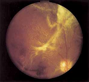 Cotton-wool spots, also referred to as soft exudates, are actually nerve fiber layer infarctions. They are white, fluffy-appearing lesions in the nerve fiber layer that result from occlusion of precapillary arterioles. Fluorescein angiography confirms the lack of capillary perfusion. Microaneurysms frequently surround older cotton-wool spots as well as larger areas of capillary nonperfusion. Venous beading (see Fig. 7) and venous loops (see Fig. 8) indicates sluggish retinal circulation and are nearly always adjacent to extensive areas of capillary nonperfusion. Focal vitreous traction is thought to contribute to their formation.9 Capillaries next to areas of nonperfusion that dilate and function as collaterals are referred to as IRMA. They are frequently difficult to differentiate from surface retinal neovascularization. Fluorescein, however, does not leak from IRMA but leaks profusely from neovascularization (see Fig. 7). The Early Treatment Diabetic Retinopathy Study (ETDRS)10 found that IRMA, multiple retinal hemorrhages, venous beading and loops, widespread capillary nonperfusion, and widespread leakage on fluorescein angiography are all significant risk factors for the development of proliferative retinopathy. Interestingly, cotton-wool spots, in the absence of the other findings, are not. Approximately 50% of patients with severe NPDR progress to proliferative retinopathy with high-risk characteristics (discussed later) within 1 year.11 PROLIFERATIVE DIABETIC RETINOPATHY Proliferative vessels usually arise from veins and often begin as a collection of fine vessels. When they arise on or within 1 disc diameter of the optic disc they are referred to as neovascularization of the disc (NVD) (Fig. 9). When they arise further than 1 disc diameter away, they are called neovascularization elsewhere (NVE) (Fig. 10). NVE nearly always grows toward and into zones of retinal capillary nonperfusion, but capillary nonperfusion is nearly always more widespread in eyes with NVD than it is in NVE.12 Interestingly, it is seen more often in patients younger than 40 compared to older patients with diabetes.13 Once the stimulus for growth of new vessels is present the vessels grow along the path of least resistance. The absence of the internal limiting membrane over the optic disc could explain the proclivity of new vessel growth at that location. Neovascularization grows readily along connective tissue scaffolding such as the posterior hyaloidal face (Fig. 11).