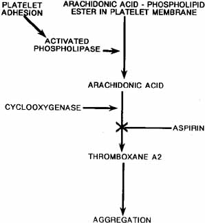 REDUCTION OF SYSTEMIC RISK FACTORS Medical Therapy ASPIRIN. Aspirin blocks the conversion of arachadonic acid to prostaglandins, thereby inhibiting platelet secretion and aggregation (see Fig. 18). Because of its success in decreasing the incidence of transient ischemic attacks (TIAs), clinicians theorized that it might retard the progression of diabetic retinopathy. The Early Treatment Diabetic Retinopathy Study found that 650 mg of aspirin daily did not influence the progression of retinopathy, did not affect visual acuity, and did not influence the incidence of vitreous hemorrhages.109 On the other hand, another group found that 990 mg of aspirin daily alone or combined with 225 mg of dipyridamole (Persantine) significantly slowed the annual appearance of new microaneurysms, but the study was not carried out long enough to demonstrate any clinical significance.110 TICLOPIDINE. Ticlopidine (Ticlid) inhibits ADP-induced platelet aggregation. Similar to aspirin, the effect is permanent for the life of a labeled platelet. It has been shown to decrease the risk of stroke in patients with TIAs. One short-term study showed statistically significant reduction in the development of diabetic retinopathy.111 PENTOXIFYLLINE. Pentoxifylline (Trental) increases retinal capillary blood flow velocity probably by improving erythrocyte and leukocyte flexibility. It decreases blood viscosity. To date, however, a clinical benefit has not been shown for diabetic retinopathy.112 Panretinal Photocoagulation When well-focused, intense light is absorbed by pigmented cells (such as erythrocytes or pigment epithelial cells), it is converted to heat, coagulating the cells and surrounding tissues. The first photocoagulator, the xenon arc, produced an intense light that was successful in obliterating neovascularization that was either on the surface of the retina or only slightly elevated (Fig. 19). Clinicians thought that eyes treated with xenon arc photocoagulation had good regression of retinopathy and fewer vitreous hemorrhages than would have been expected had they not been treated. However, xenon arc photocoagulation had severe limitations. First, the heat generated was often insufficient to obliterate highly elevated neovascularization. Second, neovascularization arising from the optic nerve could not be directly treated because the intense light beam damaged the optic nerve. Finally, in many cases, all of the neovascularization was initially obliterated, but new areas of neovascularization later developed. For these reasons, the long-term results of photocoagulation were considered by many observers to be no better than no treatment at all.