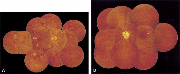 At about the same time, Aiello and co-workers,132,133 and others134–137 noted that patients with unilateral high myopia, extensive chorioretinal scarring, glaucoma, and optic nerve atrophy frequently had markedly asymmetrical retinopathy. The prior retinal or optic nerve damage seemed to protect that eye from diabetic retinopathy (Fig. 21). These investigators initiated the concept of PRP (Fig. 22). They theorized that photocoagulation burns scattered throughout the retina would decrease the retina's need for oxygen and thereby prevent neovascularization from developing or might even cause regression of existent neovascularization. Early studies showing the benefits of PRP were criticized on statistical and other grounds and were not widely accepted.138,139 It remained for a national collaborative study initiated by Davis and sponsored by the National Institutes of Health (The Diabetic Retinopathy Study (DRS)) to prove that both xenon-arc and argon-laser PRP significantly decrease the likelihood that an eye with high-risk characteristics will progress to severe visual loss.140–142 High-risk characteristics are defined as eyes with (1) NVD greater than one-fourth to one-third disc area, (2) any NVD and vitreous hemorrhage, or (3) NVE greater than one-half disc area and vitreous or preretinal hemorrhage (see Fig. 20). The main findings of the DRS are summarized in Table 1.