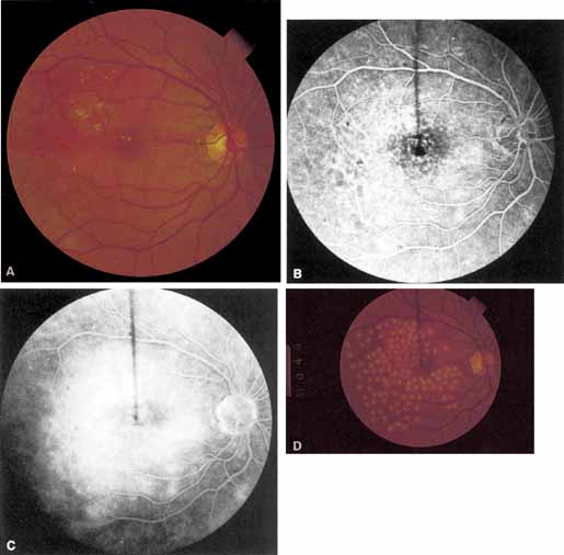 After PRP, retinal circulation is definitely improved. There is a better regulatory response to hypoxia and decreased blood flow.143,144 The exact mechanism by which PRP works remains unknown. Some investigators believe that PRP decreases production of vasoproliferative factors first by eliminating some of the hypoxic retina or by stimulating the release of anthangiogenic factors from the retinal pigment epithelium.145 An alternative hypothesis is that vessel dilatation caused by chronic hypoxia is the direct stimulus for endothelial cell proliferation and neovascularization and that PRP works by thinning the retina. Vasodilatation is reduced by increased diffusion of oxygen from the choroid.146–149 Another possibility is that PRP decreases choroidal circulation in the midperiphery, which in turn shunts blood flow centrally, (“reverse choroidal steal”) decreasing the stimulus for NVD.150 Finally, others suggest that PRP leads to an increase in vasoinhibitors either by stimulating the retinal pigment epithelium to produce inhibitors of vasoproliferation145,151 or by causing a breakdown of the blood–retinal barrier so that serum vasoinhibitors can diffuse into the vitreous.152 The goal of PRP is to arrest or to cause regression of the proliferating new vessels. The currently recommended therapy is 1600 to 2000 burns, 500 μm in diameter delivered through a wide-field or three-mirrored lens.153 The burns should be intense enough to whiten the overlying retina. This usually requires a power of 200 to 600 mW and duration of 0.1 seconds. The usual PRP decreases the electroretinogram by 40% to 70%154,155 and destroys approximately 14% of the total retinal area.155 Most ophthalmologists use the argon blue–green or green laser, but a large clinical trial has shown that krypton red is equally effective.156 The number of burns necessary to achieve these goals has not been established. Some retinal specialists feel that there is no upper limit to the total number of burns and that treatment should be continued until regression occurs.157–160 However, it remains to be proven that the eye benefits from thousands of burns. In fact, the only prospective, controlled study found that eyes that received supplementary treatment had no difference in reduction in risk factors or better visual acuity than did eyes that received only a standard PRP.161 Once the DRS had proved that PRP was effective in preventing severe visual loss in patients with high-risk characteristics, the question arose as to whether treatment of mild PDR or severe NPDR would lower still further the risk of blindness from diabetic retinopathy. The ETDRS found that PRP significantly retards the development of high-risk characteristics in eyes with severe NPDR and macular edema.11 After 7 years of follow-up, 25% of eyes that received PRP developed high-risk characteristics compared to 75% of eyes in which PRP was deferred until high-risk characteristics developed. Nevertheless, the ETDRS concluded that treatment of PPDR and of PDR short of high-risk characteristics was not indicated. First, after 7 years of follow-up, 25% of eyes assigned to deferral of PRP never developed high-risk characteristics. Second, when patients are closely monitored and PRP is given as soon as high-risk characteristics develop severe visual loss can be prevented. After 7 years of follow-up, 4.0% of eyes that did not receive PRP until high-risk characteristics developed had a visual acuity of 5/200 or less compared to 2.5% of eyes assigned to immediate PRP. The difference was neither clinically nor statistically significant. So, if all eyes with severe NPDR received PRP, many would be treated unnecessarily. Third, PRP has significant complications. PRP often causes decreased visual acuity by increasing macular edema162–164 or by causing macular pucker. Fortunately, the edema frequently regresses spontaneously over 6 months. The visual field is usually moderately decreased.113 Color vision and dark adaptation, which are often already impaired, are also worsened by PRP.114–116 Finally, PDR is associated with an increased risk of myocardial infarction and increased mortality.165 Many patients will die before they develop complications of the PDR. Peripheral Retinal Cryotherapy Peripheral retinal cryotherapy (PRC) is used to treat eyes with high-risk characteristics and with media too hazy for PRP. Reported benefits include resorption of vitreous hemorrhages and regression of NVD, NVE, and NVI.166–172 The main complication is the development or acceleration of traction retinal detachment in 25% to 38% of eyes.170,173 Therefore, this treatment should be avoided in patients with known traction retinal detachment and all patients must be carefully monitored. An alternative treatment in eyes with hazy media is transscleral diode laser photocoagulation. Treatment of Macular Edema Patz and co-workers174 were the first to show that focal argon laser photocoagulation decreases or stabilizes macular edema. Later, the ETDRS confirmed their results. The ETDRS defined clinically significant macular edema (CSME) as (1) retinal thickening involving the center of the macula, (2) hard exudates within 400 μm of the center of the macula (if they are associated with retinal thickening), or (3) an area of macular edema greater than one disc area which is within one disc diameter of the center of the macula. The treatment strategy was to treat all leaking microaneurysms farther than 500 μm from the center of the macula (Fig. 23) and to place a grid of 100 to 200 μ burns in areas of diffuse capillary leakage and in areas of capillary nonperfusion. After 3 years of follow-up, 15% of eyes with eyes with CSME had doubling of the visual angle as opposed to 32% of nontreated control eyes.175 Recent subgroup analysis showed that treatment could be deferred in eyes in which the center of the fovea is not thickened as long as hard exudates are not threatening the center. Howeve