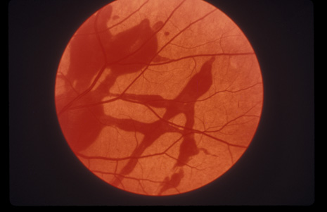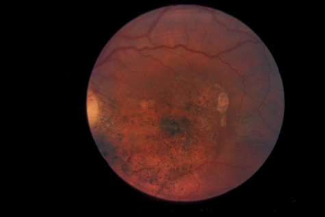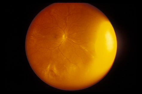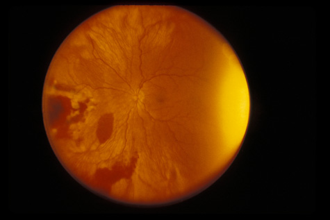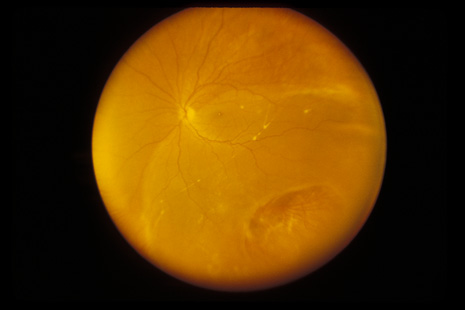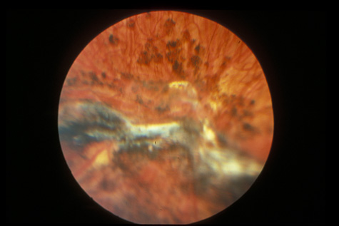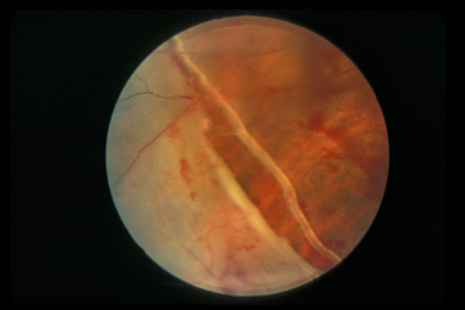 RETINITIS SCLOPETERIA Retinitis sclopeteria is the rupture of the choroid or retina caused by shock waves generated by passage of a high-velocity missile through the orbit without directly striking the eye. Initially a subretinal or vitreous hemorrhage is seen. If the optic nerve is damaged, visual acuity can be profoundly decreased. In severe cases, massive amounts of fibrous tissue proliferate into the eye (Fig. 27). In others, as the blood clears, a claw-like break is often seen in Bruch's membrane and in the choriocapillaris (Fig. 28). Retinal detachment rarely occurs at the site of the injury, probably because of binding of the retina to the choroid by fibrous tissue, but late detachment from a break at a distal site can occur.97,98