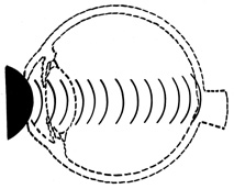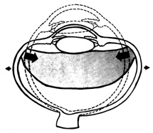 ANTERIOR–POSTERIOR COMPRESSION AND EQUATORIAL EXPANSION The volume of a closed space cannot be changed. Therefore, when the eye is compressed along its anterior–posterior axis, it must either expand in its equatorial plane (Fig. 3) or rupture. Using high-speed photography, Delori and associates27 studied blunt trauma in enucleated pig eyes. The cornea was indented 8.5 mm, reducing the original anterior–posterior axis by 41% and bringing the posterior surface of the cornea into contact with the iris and the lens. The equatorial plane was expanded to 128% of its original length. Specific examples of damage caused by this severe stretching of the ocular tissues are discussed later.