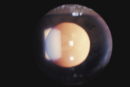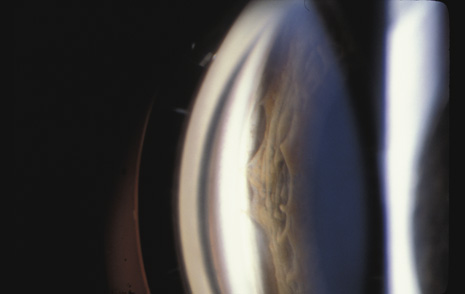 In injuries severe enough to cause a full-thickness corneal rupture, the wound usually crosses the limbus into the adjacent sclera. Exceptions are eyes that have had radial keratotomy, cataract surgery, or corneal transplantation, even years before the trauma.36–38 GLAUCOMA Acutely, the intraocular pressure may be normal, increased, or decreased. Aqueous outflow may be decreased because of angle recession, inflammatory trabeculitis, or hyphema. On the other hand, ciliary body injury tends to decrease aqueous inflow. The intraocular pressure depends on the balance of these factors. In patients who have large hyphemas, the pressure may rise abruptly. Therefore, it must be checked at regular intervals. It is especially important to monitor the intraocular pressure in hyphema patients who have sickle cell disease, be it homozygous or heterozygous. Unlike normal erythrocytes, sickled erythrocytes cannot pass through the trabecular meshwork and tend to occlude it, raising intraocular pressure. This, in turn, can cause central retinal artery obstruction even if the pressure is only in the high twenties or low thirties. Prompt paracentesis followed by surgical evacuation can restore vision.39 Late glaucoma can also develop, even years after the initial injury. Autopsy studies have found three ways by which the trabecular meshwork can be obstructed: proliferation of corneal endothelial cells and Descemet's membrane, proliferation of fibroblasts, and peripheral anterior synechiae (presumably from inflammation or from organization of blood in the angle for more than 7 days).40 Other possibilities are direct damage to the trabecular meshwork and damage to the ciliary muscle with reduced traction on the scleral spur. The risk is greatest in patients who have severe anterior segment damage such as cataract, angle recession, iris damage and displacement of the lens.41 Nine percent of patients with angle recession develop permanent glaucoma.42 If trabeculectomy is required, some authors recommend antimetabolites because the failure rate in patients with angle recession is greater than it is in patients with typical open angle glaucoma.43 LENS When the lens is struck by the cornea or by a strong shock wave, a transient anterior subcapsular cataract, known as a rosette cataract, may develop (Fig. 6). Repeated trauma, as in boxers, often causes posterior subcapsular cataract. Blunt trauma can also result in rupture of the anterior or posterior capsule.44,45 In severe cases, iridodonesis or a bead of vitreous in the anterior chamber signals a subluxed lens. Dislocation may also occur (Fig. 7). It is important to remember that ocular trauma is common, but lens dislocation is rare. Therefore, in patients with a dislocated lens, the clinician should always rule out predisposing causes such as Marfan's syndrome, homocystinuria and syphilis. In rare cases the lens itself can rupture and cause phacolytic glaucoma.