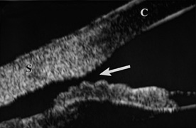 CORNEA Abrasions of the corneal epithelium are common but because they heal rapidly, they are of little consequence. Endothelial damage can be more serious. A local concussion (coup effect) can rupture endothelial cells and loosen the intercellular tight junctions. They can also be damaged by being crushed against the iris and the lens. The transient corneal edema usually clears, but endothelial damage can be permanent. Follow-up studies of patients with traumatic hyphema show endothelial cell loss that correlates with the severity of the initial injury.28,29 When a total hyphema is present, the damaged corneal endothelium may permit hemoglobin to enter the corneal stroma. Usually, high intraocular pressure is required to cause corneal bloodstaining, but cases have been reported in which the intraocular pressure was normal.30 Corneal transplantation is rarely necessary as the bloodstaining nearly always clears spontaneously, but this may require a considerable period of time. The central cornea clears last. Adults can wait for clearing, but in young children, amblyopia can develop. When the cornea is abruptly forced backward by severe blunt trauma, it presses the iris against the lens, preventing the escape of aqueous into the posterior chamber. If enough force is applied, the entrapped aqueous dissects into the ciliary body, resulting in a recessed angle (Fig. 4). This tearing of the ciliary body is responsible for approximately 90% of the hyphemas seen after blunt trauma.31,32 Other causes of hemorrhage include separation of the iris from the ciliary body (iridodialysis) and sphincter tears. Ultrasound biomicroscopy can be useful in diagnosing dissection of the ciliary body or iridodialysis (Fig. 5).33–35