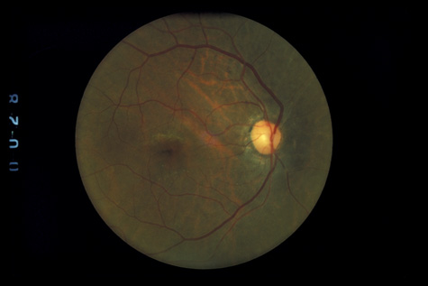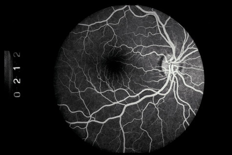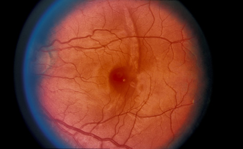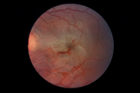 COMMOTIO RETINAE Commotio retinae (Latin, meaning retinal contusion) is a contrecoup injury. It can occur peripherally (Fig. 8) or centrally, in which case it is called Berlin's edema (Fig. 9). Immediately and for several hours after the trauma, the retina appears normal, although the patient may complain of decreased vision. Thereafter, the outer layers of affected retina become opaque. On fluorescein angiography, the opaque retina blocks background choroidal fluorescence, and in most cases there is no leakage into or under the retina (Fig. 10). For years, clinicians had difficulty explaining this blockage, because leakage is expected in conditions with edema. It was then shown in experimental animals and in human autopsy eyes that Berlin's edema is not true edema. The retinal opaqueness is the result of intracellular edema and fragmentation of the photoreceptor outer segments and intracellular edema of the underlying pigment epithelium. There is little or no intercellular fluid.66–69