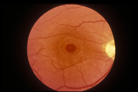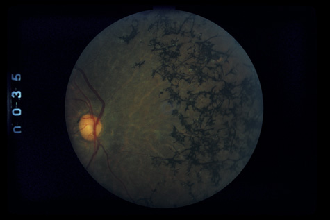The visual acuity in commotio retinae varies from 20/20 to 20/400 and does not always correlate with the degree of retinal opacification. There is no known treatment. The prognosis is usually excellent except in cases with associated subfoveolar choroidal rupture and in cases with choroidal rupture with subfoveolar hemorrhage. Poor visual recovery can also be expected in cases with severe retinal pigment epithelial damage. Serous retinal detachment (Fig. 11) signals this condition, which can be confirmed by leakage of fluorescein into the subretinal space.70 The late manifestations of contrecoup injury to the retinal pigment epithelium (RPE) vary from minor atrophic changes that are seen as transmission defects on fluorescein angiography to massive hyperplasia and migration of the RPE. This later condition results in bone corpuscular and granular pigmentation that resembles retinitis pigmentosa (Fig. 12).71,72 The traumatic pigmentary changes may be confined to the posterior pole, to the periphery, or to certain quadrants, or they may be more widespread. When the trauma to the RPE destroys photoreceptor cells, localized visual field defects result. Arcuate field defects are not found because the overlying nerve fiber nearly always remains intact. MACULAR HOLES In rare cases the retinal contusion causes cystoid macular edema that may, in turn, progress to a macular hole (Fig. 13). A macular hole can also be caused by acute posterior vitreous detachment with foveal traction. In such cases, an overlying operculum is seen. Surgically, the macular hole can sometimes be closed with vitrectomy and gas injection.73 However, in some cases macular holes can spontaneously close, and because of this possibility some suggest observation for 4 to 6 months after the injury.74,75