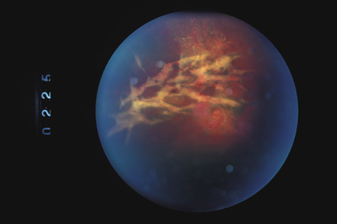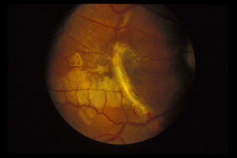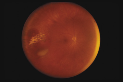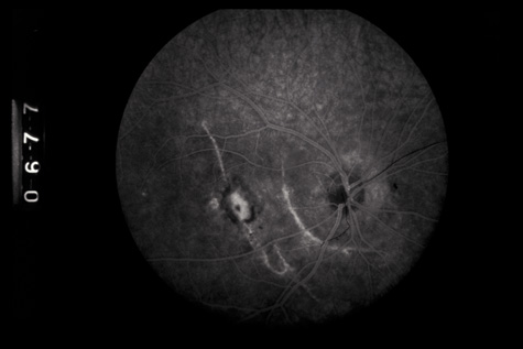 Similar to many conditions that damage Bruch's membrane, choroidal ruptures can, months to years later, be complicated by development of a choroidal neovascular membrane, with serous or hemorrhagic retinal detachment and loss of central vision (Fig. 23).87–89 They usually respond well to laser therapy. Also, studies have demonstrated that subfoveal choroidal neovascular membranes from etiologies other than age-related macular degeneration can benefit from photodynamic therapy.90,91