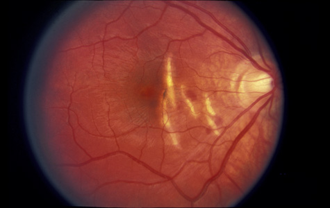 Initially, a choroidal rupture may be obscured by a subretinal hemorrhage caused by tearing of the choriocapillaris. Later, after the blood has resorbed, a white curvilinear streak concentric to the optic disc is seen. Only rarely is a rupture oriented radially with respect to the optic disk. Most are temporal to the disc and single, although nasal and multiple ruptures can also occur (Fig. 21).