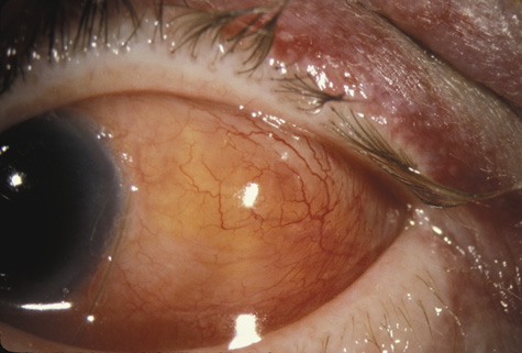 SCLERAL RUPTURE In eyes that have not undergone prior surgery, the two most common locations for scleral rupture are at the limbus (under intact conjunctiva) and parallel to the muscle insertions between the insertion and the equator. Radial and posterior ruptures are relatively uncommon.29 The hallmarks of scleral rupture are severe reduction in visual acuity, an afferent pupillary defect, hypotony (although a normal intraocular pressure does not rule out a small rupture), an abnormally deep anterior chamber, decreased ocular ductions, severe subconjunctival edema (Fig. 24), hyphema, and vitreous hemorrhage.92 The diagnosis can rarely be confirmed by ophthalmoscopy because severe vitreous hemorrhage, hyphema, or both nearly always accompany scleral rupture. Ultrasonography and computed tomography (CT) scanning may be helpful. Both show a shrunken globe. In addition, the CT scan shows subconjunctival edema (Fig. 25). In eyes in which the anterior chamber depth cannot be seen because hyphema, ultrasonography and CT scanning often show a deepened chamber. CT scanning is also useful in identifying any intraocular foreign bodies.