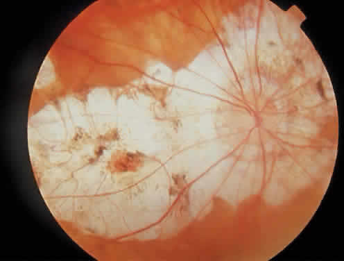 Spontaneous subretinal hemorrhage can occur in the macula of the pathologically myopic eye. The origin of the bleeding is not certain, although it probably arises from the choriocapillaris, and the hemorrhage is sometimes first noticed immediately after the appearance of a break in Bruch's membrane. Subretinal hemorrhages can be an isolated finding with a benign clinical course if choroidal neovascularization or a lacquer crack is not involved. Blood often resorbs over a period of weeks to months, and vision may return to its former level. Choroidal neovascularization may occur secondary to a defect in Bruch's membrane from a lacquer crack or a patch of RPE atrophy (Fig. 12).38 The presence of myopic choroidal neovascularization is not necessarily as ominous as it is with other conditions, such as age-related macular degeneration.38–43 Overall, up to 50% of patients with choroidal neovascularization may see spontaneous improvement or stabilization of vision. The reason for this finding is that myopic choroidal neovascular membranes often demonstrate a self-limited course, regressing spontaneously. The long-term prognosis for these patients, however, is still guarded because of recurrent subretinal hemorrhage and degeneration of the RPE and choriocapillaris. The sequelae of the myopic choroidal neovascular membrane is a round or elliptical black lesion known as Fuchs' spot, which may be seen in up to 10% of patients with pathologic myopia, usually in the macula.44,45 This lesion is sharply circumscribed, slightly elevated, and of variable size. Histopathologic examination reveals marked RPE hyperplasia in an area where a choroidal neovascular membrane has undergone spontaneously involution. Overlying fibrosis may impart a gray, yellow, green, or red coloration to the lesion; with time, the spot becomes less distinct with a surrounding halo of atrophy. Like lacquer cracks, Fuchs' spots are a poor prognostic sign, with the development of subsequent widespread chorioretinal degeneration being the rule.43 Extensive peripheral retinal changes are invariably present in pathologic myopia.26,46 Benign changes include paving-stone degeneration and the area's turning white without pressure. Posterior vitreous detachment tends to occur at an earlier age, there is a higher incidence of lattice degeneration, and the retina is relatively thin compared with the emmetrope. Not surprisingly, the risk of retinal tears and retinal detachment, sometimes bilateral, is significantly higher than in the emmetropic population. Round and multiple breaks characterize a myopic retinal detachment.47–49 Scleral ectasia can make surgical repair of retinal detachment more challenging.50,51 TREATMENT No proven treatment will halt expansion of the scleral shell in pathologic myopia. Surgical reinforcement of the posterior pole in hopes of arresting the progression of a staphyloma has been performed52 using donor sclera, fascia lata, dura mater, silicone rubber, Dacron mesh, and polytetrafluoroethylene (i.e., Gore-Tex). To date, there have been no well-documented, controlled studies demonstrating surgical efficacy.26 The role of argon laser photocoagulation to myopic choroidal neovascularization is unclear. The Macular Photocoagulation Study53 demonstrated a clear treatment benefit for patients with well-defined extrafoveal choroidal neovascularization associated with age-related macular degeneration, ocular histoplasmosis syndrome, and idiopathic membranes. A beneficial effect for neovascularization extending into the foveal avascular zone was also shown.54 Choroidal neovascularization associated with myopia, however, was not assessed in this study, and extrapolation of these results to the patients with myopia may not be appropriate. In fact, some evidence suggests that photocoagulation of neovascularization with only mild to moderate leakage on fluorescein angiography may worsen the visual prognosis compared with that in patients who are not treated.38 Photocoagulation of extrafoveal lesions may result in subsequent enlargement of the scar through the foveola and significant visual loss in up to 68% of patients. Submacular surgery, involving extraction of the choroidal neovascular membrane, has shown success when the ingrowth site lies outside the center of the fovea. It this situation, preservation of the foveal RPE is possible.55 However, if the ingrowth site appears in the foveal center, surgery is usually associated with a central RPE defect and relatively poor postoperative central vision. In these situations, photodynamic therapy shows more promise for preservation of central visual acuity. Photodynamic therapy (PDT) has recently been applied to the treatment of choroidal neovascularization secondary to pathologic myopia. A light-sensitive drug such as verteporfin, when injected intravenously, may bind preferentially to neovascular endothelia. After being activated by a wavelength-matched laser, the free radicals produced cause localized damage and vascular occlusion. At the time of this writing, the Verteporfin in Photodynamic Therapy (VIP) Study released its 1-year data for treatment of pathologic myopia with choroidal neovascularization.56 In this study, verteporfin PDT led to a significantly higher incidence of stable or improved visual acuity through 1 year of follow-up. The investigators involved in the study recommended verteporfin PDT in the treatment of subfoveal CNV in the setting of pathologic myopia. Although most clinicians treat symptomatic retinal tears in the myopic patient with retinopexy, the role of prophylactic treatment for asymptomatic retinal breaks is controversial. Treatment with cryopexy or photocoagulation to all breaks in patients who have more than 4 diopters of myopia has been advocated by several authors.57–59 Fellow eyes in patients with a history of retinal detachment, horseshoe retinal tears, symptomatic retinal breaks, and tears with surrounding subretinal fluid probably wa