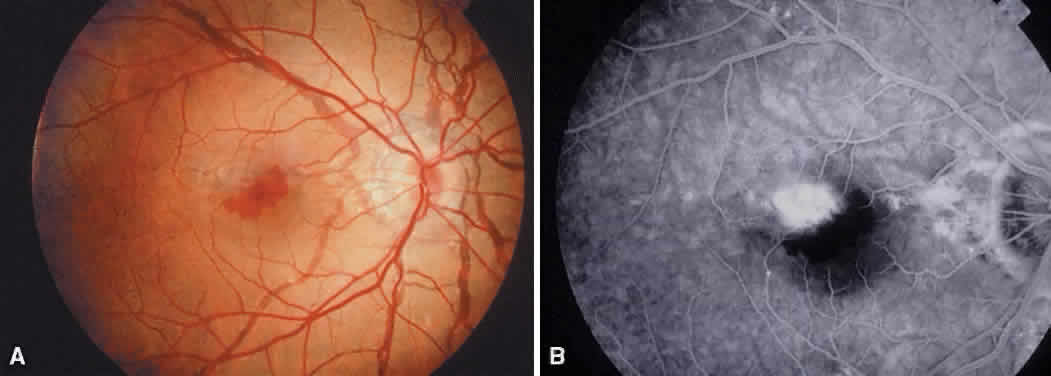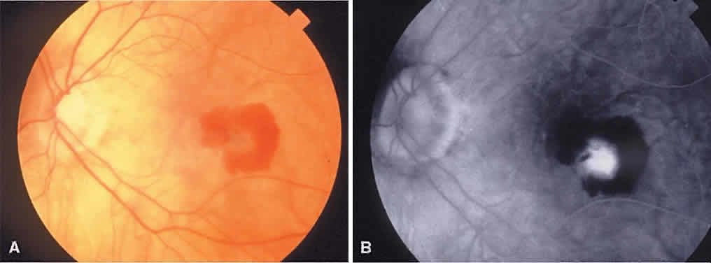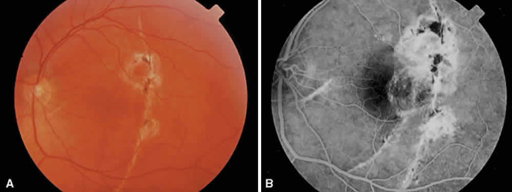 of the globe. Choroidal ruptures can occur from any trauma that results in rapid anterioposterior compression of the globe. It has been reported in various settings, including bungee elastic cords,81 paint ball injuries,82,83 and forceps birth delivery.84 Choroidal ruptures appear as yellow curved lines concentric to the optic nerve, located deep to the retina. They are most common in the posterior pole and midperipheral fundus85 (Fig. 18A). On fluorescein angiography, the ruptures appears as curvilinear window defects. There may be mild staining of the sclera, but there is no leakage unless choroidal neovascularization is also present (see Fig. 18B). Histologically, they represent disruption and retraction of the RPE, Bruch's membrane, and choroid, similar to that seen in angioid streaks. Healing of choroidal ruptures involves fibrovascular proliferation from the choroid that evolves into a dense fibrous scar with variable degrees of RPE hyperplasia, usually complete by 3 weeks.86 When the macula is involved, severe visual loss may result. Similar to angioid streaks and myopic lacquer cracks, choroidal neovascularization may occur, usually weeks to months following the initial injury. When the rupture is close to the center of the fovea (e.g., closer than 600 μm) and the length of the rupture is large (e.g., 4.5 mm or longer), closer monitoring of the eye is warranted because the risk for developing CNV is significantly higher risk.87 The pathologic mechanism of choroidal rupture formation is explained by the rapid anteroposterior compress of the globe during blunt trauma (Fig. 19A). The choroid is anchored to the sclera at the equator by the vortex veins. As the equatorial diameter of the sclera is rapidly increased by the ocular distortion, the choroid, Bruch's membrane, and RPE become stretched so rapidly that a break forms in these layers in a direction perpendicular to the line of stretch (which extends radially from the optic nerve to the equator of the globe). As a result, the choroidal rupture occurs concentric to the optic nerve (see Fig. 19B). There is no treatment for choroidal ruptures uncomplicated by submacular hemorrhage or choroidal neovascularization. There have been occasional reports in the literature of successful surgical evacuation of submacular hemorrhage with restoration of good central vision by means of vitrectomy and subretinal injection of tissue plasminogen activator.88,89 Successful surgical removal of three cases of subfoveal choroidal neovascularization with resulting visual acuities of 20/30 or better in each case has been reported90 (Fig. 20).