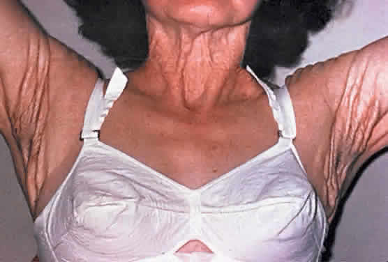 Those factors responsible for the unusual radiating configuration of angioid streaks are not clear. It has been suggested that the pull of the extraocular muscles creates stress forces against the fixed point of the optic nerve, resulting in the characteristic pattern.68 FLUORESCEIN ANGIOGRAPHY Intravenous fluorescein angiography (IVFA) can help delineate the presence of angioid streaks when the ophthalmoscopic appearance is subtle. With IVFA, angioid streaks are variably hyperfluorescent depending on the condition of the overlying RPE. Adjacent to the streaks, the RPE can be irregularly clumped, resulting in a mottled appearance. The presence of a subretinal neovascular membrane shows fluorescein dye leakage as the angiogram progresses (Fig. 16). ETIOLOGY AND HISTOPATHOLOGY Angioid streaks represent breaks or dehiscences in a thickened, calcified, and abnormally brittle Bruch's membrane. Whether the breaks can occur spontaneously or only as a result of trauma is not known. The elastic lamina that occupies the middle segment of Bruch's membrane is primarily affected, resulting in disintegration and fraying of the elastic fibers. Diffuse and extensive basophilic staining due to the deposition of calcium is commonly seen with routine hematoxylin and eosin staining. The choriocapillaris and RPE are minimally affected initially; however, with progression these structures have become secondarily degenerated. Eventually, neovascular vessels from the choroid may penetrated through the breaks in Bruch's membrane, resulting in subretinal hemorrhage, exudation, and edema followed by the fibrovascular deposition that is typical of a disciform scar. All cases of angioid streaks studied histopathologically have shown identical changes despite different underlying systemic diseases.65 The initiating stimulation for the calcification and degeneration of Bruch's membrane in patients with angioid streaks is not yet known. CLINICAL CORRELATION The most important complication of angioid streaks is the development of subretinal neovascularization with subsequent serous and/or hemorrhagic detachment of the sensory retina. Visual disturbances or symptoms secondary to angioid streaks are highly atypical unless such a subretinal neovascular membrane is present. Other complications include subretinal hemorrhage without neovascularization; this can occur either spontaneously or with relatively minor ocular trauma. The most common systemic disease associated with angioid streaks is pseudoxanthoma elasticum. In one large series, approximately half the patients with angioid streaks had pseudoxanthoma elasticum.69 Pseudoxanthoma elasticum is a systemic disease the hallmark of which is abnormal skin and subcutaneous tissue but the clinical spectrum of which may include arterial insufficiency secondary to calcification of blood vessel and gastrointestinal bleeding. Skin findings are classic and are most commonly seen in the neck, axillary, inguinal, and periumbilical areas. They are said to resemble the skin of a “plucked chicken” (Fig. 17). There is no gender or racial predilection, and both autosomal dominant and recessive inheritance modes have been described. A primary disorder of elastic tissue is the underlying pathophysiology.