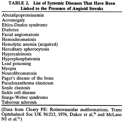 Angioid streaks occur in 80% to 87% of all patients with pseudoxanthoma elasticum.65 Aside from angioid streaks, other associated ocular findings with pseudoxanthoma elasticum include diffuse mottling of the RPE, especially temporal to the fovea (peau d'orange) and “punched out” peripheral chorioretinal lesions, similar to the lesions associated with ocular histoplasmosis (see Fig. 15). Between 8% and 15% of patients with Paget's disease of the bone (osteitis deformans) have angioid streaks as well.65 Paget's disease is characterized by heavily calcified bones. The pelvis, skull, femur, and humerus are most commonly affected. The underlying pathogenesis is an exuberant osteoclastic reaction with a secondary osteoblastic response. Some evidence suggests a slow virus is responsible.65 Diagnosis can be confirmed most readily by an elevated serum alkaline phosphatase level followed by confirmation by radiologists or a bone scan. Patients with sickle cell disease can develop angioid streaks. Various studies have found incidence to be 6% or lower. There is a strong correlation between age and the development of angioid streaks. This explains why studies on patients with SS type disease, most of whom are younger than age 40, show a low incidence of angioid streaks. Angioid streaks are rarely seen in patients younger than the age of 25. Many other systemic diseases have been linked to the presence of angioid streaks (Table 2)70,71 although some of these associations may represent coincidental occurrences. The workup for systemic disease in patients with angioid streaks might include skin biopsy; studies to measure serum alkaline phosphatase, calcium, and phosphate levels; and a hemoglobin electrophoresis.