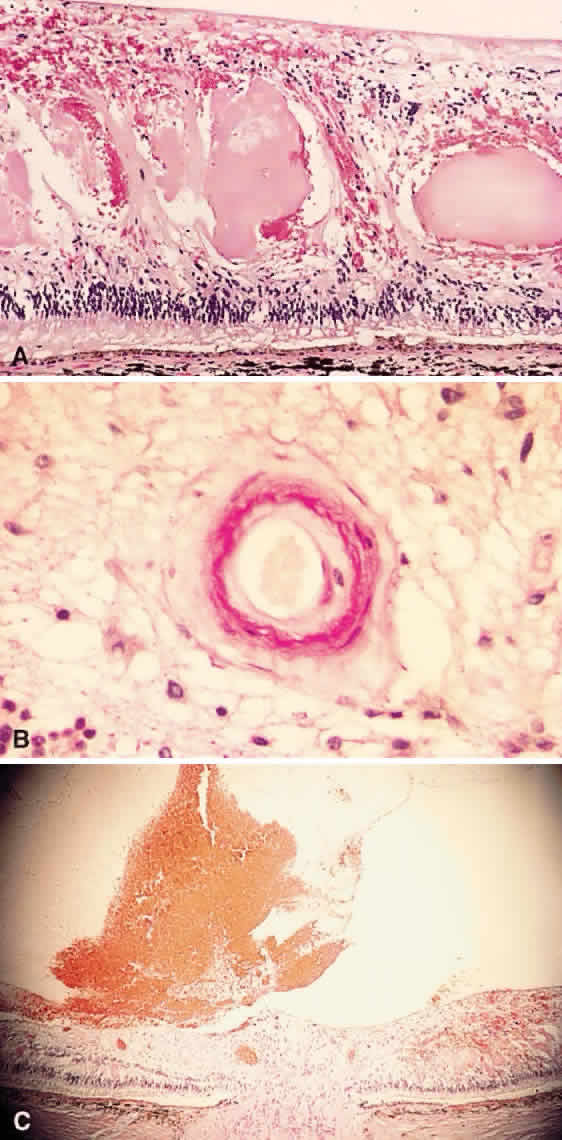 diabetic retinopathy. Irvine and Wood9 irradiated monkey eyes with up to 30 Gy and examined them histologically. The first changes, seen 12 to 24 months after irradiation, were focal loss of capillary endothelial cells and pericytes (see Fig. 1b). Archer and colleagues10 examined human eyes enucleated after radiation treatment and found endothelial cell loss. Fusiform capillary dilations and microaneurysms develop in areas of poorly supported capillaries (see Fig. 1c). Telangiectatic channels also develop, presumably caused by alterations in hemodynamics. Lower degrees of radiation damage cause the vascular endothelial cells to remain viable but lose the integrity of their intercellular tight junctions. The blood vessels become abnormally permeable to larger molecules, leading to leakage of fluid and proteins (see Fig. 1c). Archer and colleagues10 performed electron microscopic studies that revealed new intraretinal vessels containing fenestrated endothelium, suggesting an alternative mechanism of vascular leakage. Light microscopic examination of the retina reveals intraretinal blood from burst microaneurysms (see Fig. 1d) and eosinophilic exudates in the outer plexiform and inner nuclear layers (Fig. 2A). In more severe cases of radiation damage, the endothelial cells die, and the vascular channels become occluded, leading to capillary dropout and ischemia. As areas of capillary loss become confluent, cotton-wool spots are seen clinically. These subsequently fade as large areas of retinal capillary nonperfusion develop.9 Later in the course, larger vessels become affected, possibly related to thickening of the vessel walls from a deposition of fibrillary or hyaline material10 (see Fig. 2B). Retinal ischemia, presumably mediated by vasoproliferative factors, leads to neovascularization of the retina and optic disc (see Fig. 2C), vitreous hemorrhage, and neovascular glaucoma. |