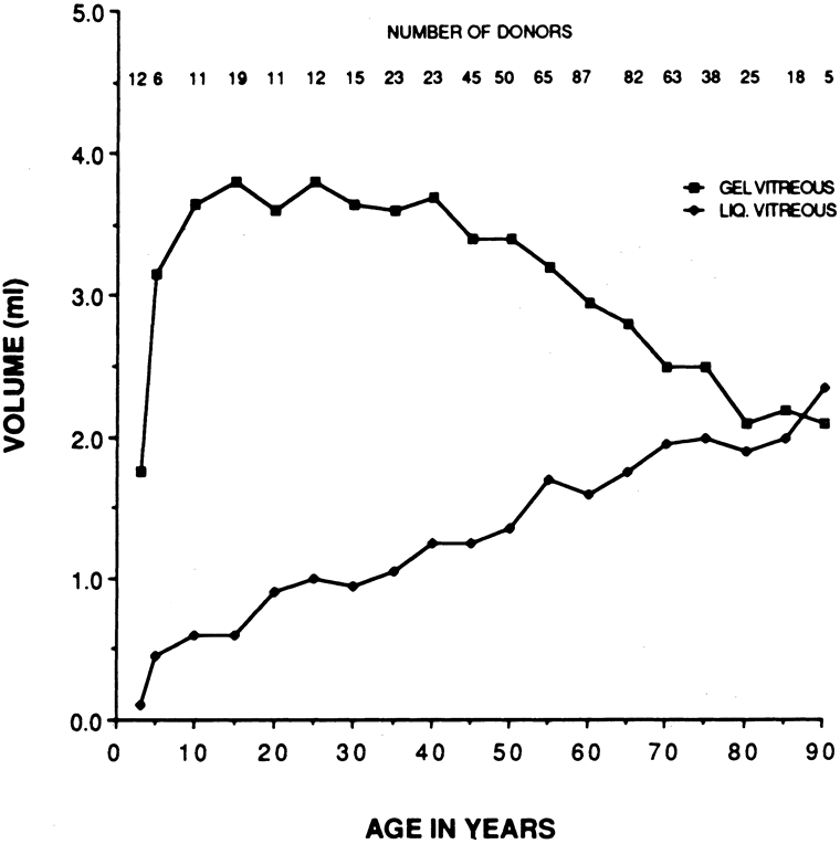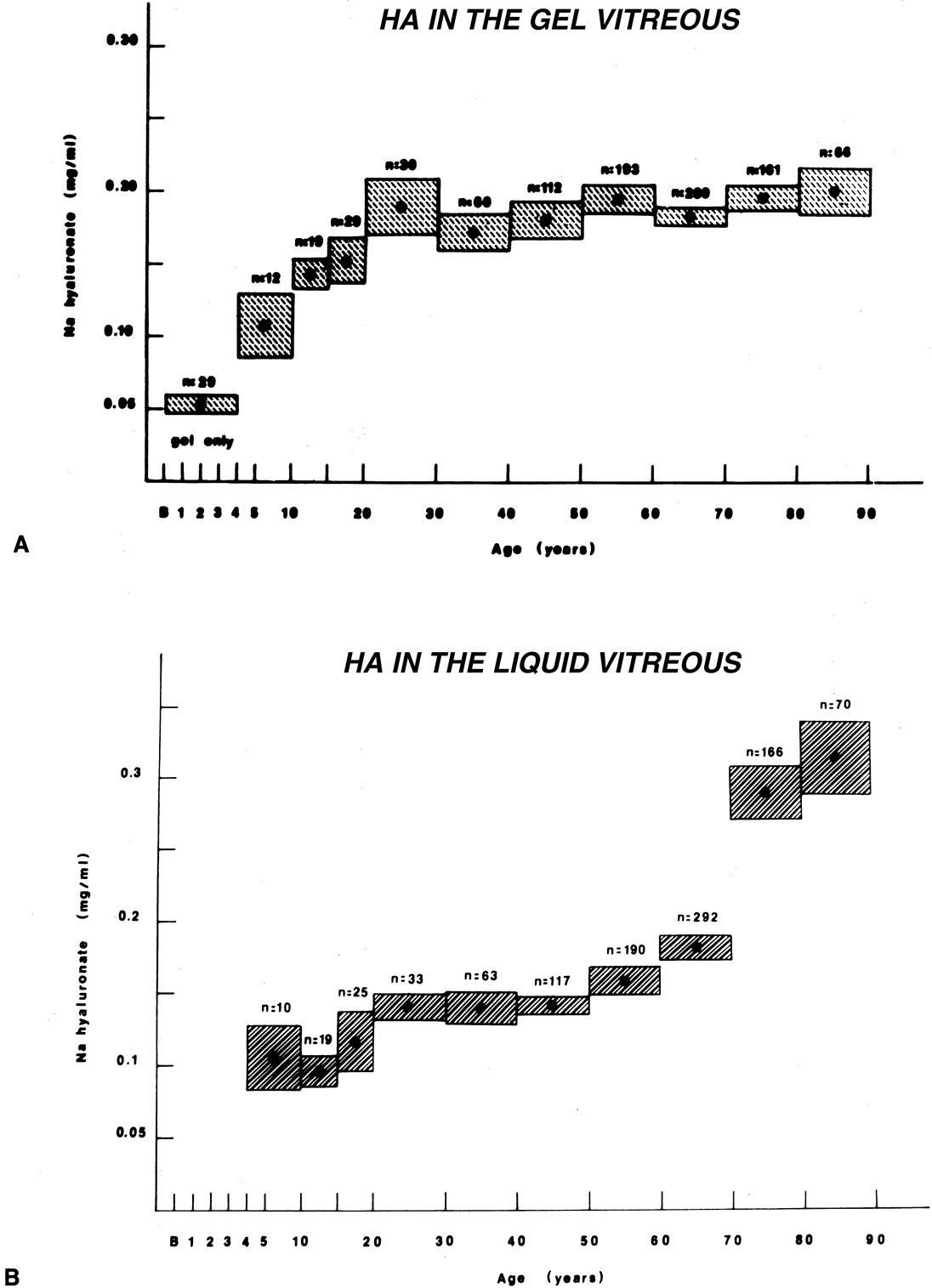 BIOCHEMICAL CHANGES Using slit lamp biomicroscopy in a clinical setting, Busacca75 and Goldmann76 observed that after the ages of 45 to 50, there is a decrease in the gel volume and an increase in the liquid volume of human vitreous. Eisner77 qualitatively confirmed these clinical findings in his postmortem studies of dissected human vitreous and observed that liquefaction begins in the central vitreous. In a large autopsy study of formalin-fixed human eyes, O'Malley78 provided quantitative evidence to support these observations. He found that more than half of the vitreous body was liquefied in 25% of persons age 40 to 49 and that this increased to 62% of those age 80 to 89. Oksala79 used ultrasonography in vivo to detect echoes from gel-liquid interfaces in 444 normal human eyes and found progressive liquefaction with age. Vitreous liquefaction actually begins much earlier than the ages at which clinical examination or ultrasonography detects changes. Balazs and colleagues80,81 found evidence of liquid vitreous after age 4 and observed that by the time the human eye reaches its adult size (ages 14 to 18) 10% to 12.5% of the total vitreous volume consists of liquid vitreous (Fig. 2). In these postmortem studies of 610 fresh, unfixed human eyes, it was observed that after age 40, there is a steady increase in liquid vitreous that occurs simultaneously with a decrease in gel volume. By the ages of 80 to 90 years more than half the vitreous body is liquid. The finding that the central posterior vitreous is where liquefaction begins77 and where fibers are first observed82–84 is consistent with the concept that dissolution of the hyaluronic acid (HA)–collagen complex results in the simultaneous formation of liquid vitreous and aggregation of collagen fibrils into bundles of parallel fibrils seen as large fibers.83 In the posterior vitreous, such age-related changes often form large pockets of liquid vitreous.85 Age-related rheologic changes in the vitreous may result from an alteration in HA-collagen interaction. Chakrabarti and Park86 claimed that the interaction between collagen and HA is dependent on the conformational state of each macromolecule and that a change in the conformation of HA molecules could result in vitreous liquefaction and aggregation or cross-linking of collagen molecules. Armand and Chakrabarti87 detected differences in the structure of the HA molecules present in gel vitreous and those in liquid vitreous, suggesting that such conformational changes occurred during liquefaction. Whether these changes are cause or effect is not known. However, Andley and Chapman88 demonstrated that singlet oxygen can induce conformational changes in the tertiary structure of HA molecules. Ueno and associates52 suggested that free radicals generated by metabolic and photosensitized reactions could alter HA and/or collagen structure and trigger a dissociation of collagen and HA molecules, ultimately leading to liquefaction. This is plausible because the cumulative effects of a lifetime of daily exposure to light may influence the structure and interaction of collagen and HA molecules by the proposed free radical mechanism(s). Enzymes, such as endogenous metalloproteinases, may also be involved in liquefying the gel vitreous. The importance of vitreous liquefaction in the pathogenesis of posterior vitreous detachment is discussed below. Total vitreous collagen content does not change after the ages of 20 to 30 (Fig. 3). However, the collagen concentration in the gel vitreous at the ages of 70 to 90 (approximately 0.1 mg/mL) was found to be significantly greater than at the ages of 50 to 60 (slightly more than 0.05 mg/mL; p < .05). Because the total collagen content does not change, this finding is most likely due to the decrease in the volume of gel vitreous that occurs with aging (see Fig. 2) and a consequent increase in the concentration of the collagen remaining in the gel. The collagen fibrils in this gel become packed into bundles of parallel fibrils,83 perhaps with cross-links between them. Aging of collagen throughout the body is associated with increased cross-linking as manifested by decreased solubility,89 increased collagen “stiffness,”90 and increased resistance to enzymatic degradation.91 There is also an increase in a reducible lysine-carbohydrate condensation product with increasing age.92 Although similar investigations have not been performed on vitreous collagen, studies by Snowden and colleagues93 demonstrated that with aging, there is a decrease in the quantity of bovine vitreous collagen solubilized by heat alone. This could result from an increase in collagen cross-linking or, as suggested by the authors, from changes in the surrounding glycoproteins and proteoglycans. Abnormal collagen cross-links have been identified in diabetic human vitreous,94 suggesting “precocious senescence” of vitreous collagen as has been described for other organs and tissues in diabetic patients.95–97 Vitreous HA concentration increases until about the age of 20, when adult levels are attained (Fig. 4A). HA concentration does not change in either the liquid or gel vitreous from ages 20 to 60 (Fig. 4).81,98 This necessarily means that there is an increase in the HA content of liquid vitreous and a concomitant decrease in the HA content of gel vitreous, since the amount of liquid vitreous increases and the amount of gel vitreous decreases with age (see Fig. 2). This is consistent with the concept that vitreous liquefaction is associated with a “redistribution” of HA from the gel to the liquid vitreous. With advanced liquefaction, there is a marked increase in the concentration of HA in liquid vitreous at ages 70 to 90 (Fig. 4B). Vitreous soluble protein concentrations also increase from 0.5 to 0.6 mg/mL at ages 13 to 50, to 0.7 to 0.9 mg/mL at ages 50 to 80, and to 1.0 mg/mL above the age of 80.80,81,98 This increase may result from an age-related breakdown in the blood–o
