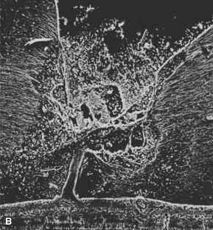 RETINITIS PIGMENTOSA In 1949, Berliner228 made very detailed descriptions of the vitreous changes in retinitis pigmentosa as seen by slit lamp biomicroscopy. The appearance of particulate structures is believed to result from melanin pigment granules embedded in the matrix of vitreous collagen fibrils.229 Cells that are found in retinitis pigmentosa vitreous include uveal melanocytes230 and macrophages derived from blood monocytes that gain access by way of abnormal retinal vessels, migrated retinal pigment epithelial cells, or hyalocytes. In favor of the hyalocyte origin are the histologic features of invaginated nuclei and long, slender pseudopodia.229 Newsome and Michels231 recently employed monoclonal antibody techniques to identify the cells in retinitis pigmentosa vitreous and found T helper and suppressor cells, activated T cells, and some B cells. SYNCHYSIS SCINTILLANS Synchysis scintillans, a condition of vitreous opacification, is related to any pathologic process that results in chronic vitreous hemorrhage. The vitreous opacities are noted when frank hemorrhage is no longer present and appear as flat, golden brown, refractile bodies that are freely mobile. They are associated with liquid vitreous, so they settle to the most dependent portion of the vitreous body when eye movement stops. The vitreous surrounding these opacities is degenerated and liquefied, leading to collagen displacement peripherally.71 Chemical studies have demonstrated the presence of cholesterol crystals in these opacities, and the condition is sometimes referred to as cholesterolosis bulbi.232 Free hemoglobin spherules in the vitreous have also been reported.233 ASTEROID HYALOSIS Asteroid hyalosis is a generally benign condition characterized by small white or yellow-white spheric or disc-shaped opacities throughout the vitreous body. The prevalence of this condition in the general population is about 0.042% to 0.5%, affecting all races, but with a male-to-female ratio of 2:1. Curiously, asteroid hyalosis is unilateral in over 75% of cases. Asteroid bodies are intimately associated with the vitreous gel and move with typical vitreous displacement during eye movement. This fact led Rodman and colleagues234 to suggest that there was a relationship to vitreous fibril degeneration. However, posterior vitreous detachment, either complete or partial, occurs less frequently in asteroid hyalosis than in age-matched controls.235 Histologic studies demonstrated a crystalline appearance to asteroid bodies, with a positive staining pattern to fat and acid mucopolysaccharide stains that was unaffected by hyaluronidase pretreatment.234 Electron diffraction studies showed the presence of calcium oxalate monohydrate and calcium hydroxyphosphate.236 Streeten237 performed ultrastructural studies and found intertwined ribbons of multilaminar membranes with a 6-nm periodicity that she interpreted as characteristic of complex lipids, especially phospholipids, lying in a homogeneous background matrix. In these investigations, energy-dispersive x-ray analysis showed calcium and phosphorus to be the main elements in asteroid bodies. Electron diffraction structural analysis demonstrated calcium hydroxyapatite and possibly other forms of calcium phosphate crystals. The etiology of asteroid hyalosis is not clearly understood. There have been reports suggesting an association between asteroid hyalosis and diabetes mellitus.238,239 Others dispute such an association.240,241 Asteroid hyalosis appears to be associated with certain pigmentary retinal degenerations as reported by Sebag and coworkers,242 although it is not known whether this is related to the presence of diabetes mellitus in these patients. Yu and Blumenthal243 proposed that asteroid hyalosis resulted from aging collagen, whereas other studies suggested that asteroid formation is preceded by depolymerization of hyaluronic acid.244 AMYLOIDOSIS Amyloidosis may result in the deposition of opacities in the vitreous of one or both eyes. Bilateral involvement may be an early manifestation of the dominant form of familial amyloidosis, although rare cases of vitreous involvement in nonfamilial forms have been reported.245 The opacities first appear in the vitreous cortex adjacent to retinal blood vessels and later appear in the anterior vitreous.246 Initially, the opacities are granular, with wispy fringes, and later take on a “glass wool” appearance.71 When the opacities form strands, they appear to attach to the retina and the posterior aspect of the lens by thick footplates.237 Following PVD, the posterior vitreous cortex is observed to have thick, linear opacities that follow the course of the retinal vessels. The opacities seem to aggregate by “seeding” on vitreous fibrils and along the posterior vitreous cortex.237 When visually significant, the opacified vitreous can be safely removed surgically. Specimens that have been studied histopathologically have contained starlike structures with dense, fibrillar centers. The amyloid fibrils are 5 to 10 nm in diameter and are distinguished from the 10- to 15-nm vitreous fibrils by stains for amyloid and by the fact that the vitreous fibrils are very straight and long.237 Electron microscopic studies confirmed the presence of amyloid, and immunocytochemical studies247 identified the major amyloid constituent as a protein resembling prealbumin. Streeten237 considered that hyalocytes could perform the role of macrophage processing of the amyloid protein before its polymerization. This may further explain why the opacities initially appear at the posterior vitreous cortex, where hyalocytes reside (see Chapter 38 in this volume). NEOPLASIA Cell invasion of the vitreous may occur as a result of intraocular neoplasia as well as ocular involvement in extraocular neoplasia. In retinoblastoma, especially the endophytic form, cells traverse the vitreous and adhere to basal laminae at various sites. Occasionally, clumps of retinoblasto