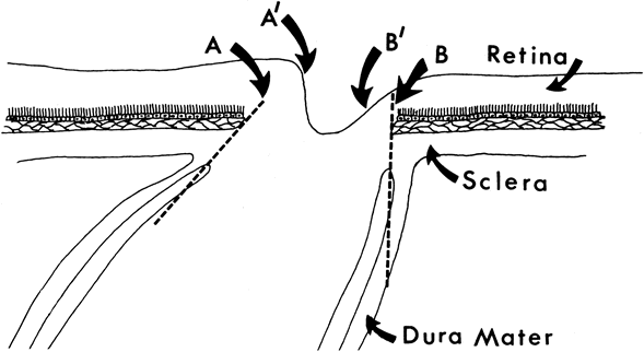 The axons maintain an orderly grouping in the retina as bundles partitioned by sheets of Müller's cells.1–3 A sheen reflected from the many bundles taking parallel courses gives the retina a striated appearance4 that is most prominent where the nerve fiber layer is thickest near the disc, especially in the arcuate bundles arriving at the poles of the disc from the temporal arcades.5,6 The attentive observer can see the striae of light reflected from these bundles and recognize their partial or total absence when bundles of axons disappear in glaucomatous or other forms of optic atrophy.4,7–10 The backscatter of light is determined by the cylindric nature and size of the light-scattering structures, possibly the axonal microtubules. They produce reflection with directional, spectral, and polarization (retardation) properties that have been studied and quantified, providing a basis for measuring the integrity of the retinal nerve fiber layer.11–14 The manner of layering of axons within intraretinal bundles2,3,6,15 may not be exactly the same in all primate species. However, a basic orderliness is present in the retina and seems to be maintained in the chiasm and beyond to the lateral geniculate body.16–19 Discrete scotomas and other defects caused by damage to nerve fiber bundles are produced by localized insults in the retinal nerve fiber layer or in the optic nerve head. Diffuse pressure on the posterior optic nerve by a mass lesion typically produces a central scotoma or diffuse visual dysfunction, but occasional instances of more localized damage in this region produce well-localized nerve fiber bundle defects, attesting to the existence of orderly bundles in this region also.12–15 On arriving at the lateral geniculate body, the axons are still organized and synapse in an orderly array. In the retinal nerve fiber layer, axons converge from every direction toward the optic disc and turn to enter the optic nerve through an opening in the outer retina, the choroid, and the sclera. The features and anatomic variation of the normal optic nerve head, or optic disc, are illustrated in Figures 2, 3, 4, 5, 6, 7, 8, 9, 10, 11, 12, 13, 14, 15, and 16. A physiologic excavation (cup) results if the chorioscleral canal is larger than required for the approximately 1 to 1.5 million axons and the supporting glial cells and blood vessels. The size of the excavation depends on how ample is the size of the chorioscleral canal.20,21 In discs where the chorioscleral canal matches the number of axons, the chorioscleral canal itself is typically somewhat taller than it is wide (Figs. 2 and 3). However, because the number of nerve fibers entering the upper and lower poles of the disc is greater than in the temporal and nasal sectors, the boundary of the physiologic cup is more or less circular.22 When the disc is large, it may be nearly circular but the cup likewise nearly circular. However, except in discs of anomalous shape, the width of the rim of neuroretinal tissue is noted in normal, nonglaucomatous optic discs to be greatest in the inferior meridian followed by the superior meridian, and narrowest in the temporal quadrant.23 The shape of the physiologic cup is affected by the obliquity of the wall of the canal through the choroid and sclera. The wall of the cup is steep where the wall of the canal is angled outward.24 Where the canal has a wall perpendicular to the ocular coats the cup has a sloping wall (Fig. 4). The slope of the cup may vary from one sector to another, and there is considerable individual variation in the size and shape of the chorioscleral canal and therefore of the optic cup. In many eyes, the optic nerve exits through a canal the passes nasally and upward into the orbit, so that the upper nasal neuroretinal rim is bounded by a steep wall when viewed from the ophthalmoscopic viewpoint, while the lower temporal wall is of the cup is sloped, so that ophthalmoscopically the cup wall is, in essence, being viewed from within the cup rather than from above. In other discs, particularly those with a large cup, the walls are perpendicular to the scleral wall in all meridians. There is also typically no evident slope of the exit canal in eyes with only a small dimple of a cup, resulting from a near-perfect match between the size of the chorioscleral canal and the amount of neuroretinal tissue (axons and glia) that comprise the optic disc. The normal anatomic variations were noted and classified by Eschnig,25 and the glaucomatous changes to be discussed below are superimposed on the anatomic character present natively. The canal through which the optic nerve exits from the eye traverses several layers of peripapillary tissue: the outer retina, the pigment epithelium, Bruch's membrane, the choriocapillaris, the outer choroid, and the sclera. In nearly all human eyes, in all or some meridians, a flange of sclera extends as far forward as the pigment epithelium, forming something of a border for the canal,25,26 and this can be seen ophthalmoscopically as a scleral rim around the disc (Figs. 5, 6, and 7). With or without such an obvious flange, the several chorioretinal layers may not be perfectly aligned with one another. Perhaps most typically, as the optic nerve exits obliquely in an upper nasal direction, the lower temporal sector of the disc viewed ophthalmoscopically is seen to have a crescent of misaligned edges of the several chorioretinal layers, such that the outer choroid and sclera may be left uncovered by the choriocapillaris and pigment epithelium (Fig. 8). Because of the tilt, the scleral flange is not seen as a narrow band; instead, by ophthalmoscopy its inner surface is viewed obliquely as it merges with the optic nerve sheath. In some myopic eyes, the crescent is most extensive on the temporal side, and in other eyes the crescent may be directly inferior, or for that matter less frequently in almost any position. In yet other variations the crescent encompasses much 