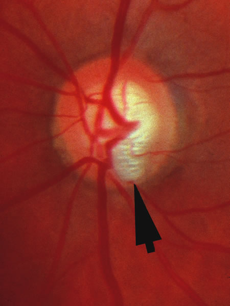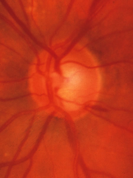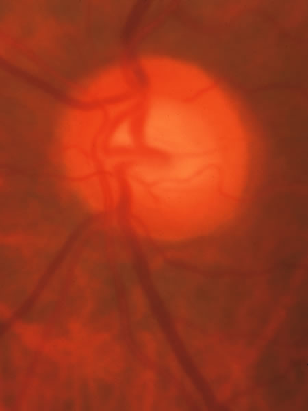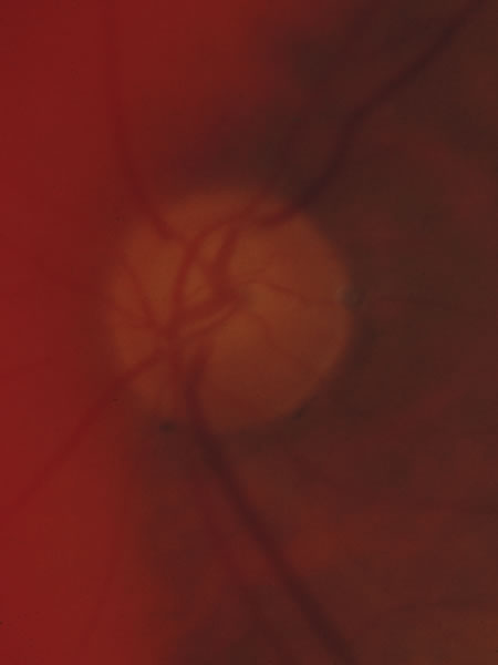 To be clear, the purpose of noting the quantified or qualitative features of the disc in clinical practice is twofold with reference to glaucoma: to recognize whether the disc is damaged and to recognize whether there has been further damage since a previous examination. For the first purpose it is important to be familiar with the variations in appearance of normal optic discs (Figs. 2, 3, 4, 5, 6, 7, 8, 9, 10, 11, 12, 13, 14, 15, and 16), and how each of these may change as damage occurs (Figs. 17, 18, 19, 20, 21, 22, 23, 24, 25, 26, 27, 28, 29, 30, 31, and 32). With experience, presence of damage may be recognized by a single examination. In the next paragraphs the features to note will be described, but there is room for improvement in the ability to recognize abnormality accurately and efficiently in clinical practice. An advantage of automated image analysis is that it is less dependent on the experience and expertise of the individual clinician. For the second purpose (determining change), a means to record the state of the disc on the baseline occasion is needed. Drawings are perhaps used by most clinicians, but depend on the observational method used (direct ophthalmoscopy, binocular indirect ophthalmoscopy, biomicroscopy) as well as the talent of the artist-clinician to represent a three dimensional configuration on a two-dimensional drawing. High-magnification stereoscopic photographs are often a better record of the disc's state, but too often after years pass, progression is still difficult to judge if a different camera is used, exposure, magnification, and degree of stereopsis is not the same, and the development or removal of cataract affects the image. Sometimes, too, in regions of the disc without vessels or surface texture, the tissue surface may not be easily appreciated even in stereoscopic photographs. Images created by other methods (for example scanning ophthalmoscopy) are sometimes subject to the same lack of standardization or reproducibility. Both recognition of the presence of damage and the recognition of change are particularly problematic in one frequent disc configuration, that with a somewhat tilted exit of the nerve upward and nasally (Figs. 8 and 14, 15, and 16). In these discs, the cup surface slopes in the lower temporal quadrant, which is often also devoid of major vessels to help localize the surface. In the ophthalmoscopic view, this surface simply recedes away from the observer and loss of tissue is difficult to identify, as the tissue simply becomes thinner and paler. Only in the more advanced stages might the cupping be recognized by the formation of a distinct notch at the inferior pole at one edge of the lower temporal sector. It is particularly unfortunate that this region of the disc is so typically the earliest and most involved, corresponding to the upper hemifield visual field abnormality. Moreover, in this sector it is difficult to evaluate the thickness of the layer of retinal nerve fibers crossing the disc margin.82 These problematic features are most difficult in the disc of with high axial myopia, because the sclera simply curves backward to merge with vaginal sheaths of the optic nerve, the choroid gradually thins within the β zone as it approaches the nerve exit, and it becomes arbitrary to designate any location as the margin of the disc itself. Fortunately, the difficulties and limitations just emphasized are problematic only in some cases, both in describing and quantifying the features of a normal and abnormal optic disc, but we can nonetheless make useful notations of the characteristics of the optic disc configuration. Efforts to observe and record these features are in most cases very useful for the diagnosis of glaucoma and for monitoring its progress. The area (or diameter) of pallor may be described separately from the size of the cup.84 As a descriptive matter, the region of pallor represents the base of the cup, and its diameter is judged there, while the cup diameter is conventionally judged at or near the inner retinal surface. It is not typical of glaucoma for the tissue of the neuroretinal rim to be pale in glaucoma, but for the tissue to be absent in the affected part of the neuroretinal rim. If there is any rim tissue present with a sector of pallor, nonglaucomatous atrophy must be suspected (except at times as a residual of an acute attack of glaucoma). Glaucomatous loss of axons and thinning of the neuroretinal tissue may be diffuse or localized. If the axons are lost diffusely, the excavation may enlarge concentrically,58,85,86 retaining its round outline, and may be difficult to distinguish from a physiologic configuration.87 This is completely analogous to the difficulty in recognizing diffuse axon loss by visual field testing. The pathologic nature of the enlarged excavation can be recognized if it can be compared to the previous status of the disc58 (hence the importance of careful documentation of the optic disc appearance in all patients with elevated intraocular pressure) or if the degree of enlargement is different in the two eyes59 (acquired enlargement may be asymmetric but the physiologic cups are nearly always the same in the two eyes,88–96 unless there is anisometropia or other congenital asymmetry). Sometimes the experienced observer can pinpoint the physiologic nature of the large excavation by recognizing that the diameter of the scleral canal is unusually large in comparison with the diameter of the emerging central retinal vessels (Figs. 11 to 13). Large, round scleral canals, as opposed to smaller canals that are taller than they are wide, seem particularly common in black patients, and in such discs the branches of the central retinal vessels may dive through the pink neuroretinal rim rather than pass along its surface into the large physiologic cup. In the absence of such clues, and in any event if the intraocular pressure is elevated, an excavation larger than 0.6 cup-to-disc ratio is u