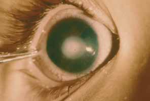 RUBELLA Congenital rubella can produce serious ocular and systemic defects. Systemic abnormalities involve the cardiac, auditory, and central nervous systems. Ocular manifestations may present as glaucoma, cataract, keratitis, uveitis, microcornea, or pigmentary retinopathy. Glaucoma may occur during infancy with isolated trabeculodysgenesis and responds to goniotomy (Fig. 22). The inflammation accompanying active rubella infection may produce elevations in intraocular pressure that should be treated with aqueous suppressants rather than goniotomy.