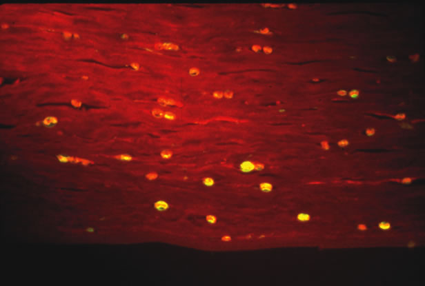 VIRUSES Viruses are typically submicrometer in size and cannot be directly visualized by light microscopy. Characteristic cellular changes can sometimes be identified as, for example, the cytoplasmic inclusion bodies of herpes infection on hematoxylin-eosin–fixed sections or on the Tzanck smear (in which the fluid from a suspected herpetic vesicle is stained with Giemsa, Papanicolaou, and Wright's stain; multinucleated giant cells indicate herpetic infection). Viruses can be directly observed by electron microscopy, but this is rarely used clinically because of the difficulty in specimen preparation and the low yield of positive results. Specific antisera for many viruses are available, and can be used to identify virally infected cells; however, this technique is typically used in research settings because it generally requires fixed biopsy tissue with preserved cytoarchitecture. PARASITES Some parasites can be seen free living under the microscope. Onchocerca volvulus, the causative agent of river blindness, can be directly observed swimming out of skin or corneal biopsies incubated in saline or culture medium. Modern imaging techniques are increasing the range of organisms that can be directly detected in situ. In particular, the confocal microscope has been successfully used to visualize Acanthamoeba in infected corneas.2 Certain parasites causing ophthalmic disease can be visualized with special stains. Acanthamoeba species can be visualized on corneal scrapings with PAS or GMS stains, or with the fluorescent dyes calcifluor white or acridine orange (Fig. 3). Both techniques require a fluorescent microscope to visualize the dye. Calcifluor white (a whitening agent used in laundry detergents) stains Acanthamoeba cell walls and fluoresces green under ultraviolet illumination. Toxoplasma gondii can be visualized with PAS or GMS stains from biopsy material. Specific antisera can be used in stains of biopsy specimens.