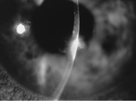 of filamentous fungi but are not absolute requisites for infection. The principal risk factors for yeast or Candida keratitis are protracted epithelial ulceration, penetrating keratoplasty, and therapeutic soft contact lens wear. Concurrent administration of topical corticosteroids enhances the replication of Candida through suppression of the host inflammatory response. Although polymicrobial keratitis is uncommon, risk factors for Candida are comparable to bacterial keratitis, and Candida is the most common genus among mixed bacterial and fungal keratitis.26,27 Polyfungal keratitis is rare.14 The distinct biomicroscopic signs of infectious microbial keratitis are epithelial and stromal ulceration (vs. intact epithelium), necrotizing stromal inflammation (vs. nonnecrotizing inflammation), and single location (vs multifocal sites) of the stromal inflammation. These distinctive signs are determined by the strain (virulence) of the responsible organism(s); the mechanism of inoculation into the cornea; the time interval from inoculation to examination; the antecedent status of the cornea; antimicrobial or corticosteroid therapy; and other host factors, such as an ocular surface abnormality, tear dysfunction state, lid closure dysfunction, and immunosuppression. Other biomicroscopic signs are helpful in judging the severity of the inflammatory process but not the presence or type of infection. These include epithelial edema, stromal edema, loss of endothelial reflectivity (pseudoguttata), endothelial plaque, aqueous flare and cells, and hypopyon. In the early stages of infection, filamentous fungi produce signs that are readily distinguishable from yeast or bacterial keratitis. The most distinctive sign is the presence of delicate, fine, feathery, opalescent, gray-white or yellow-white material in the anterior stroma, surrounded by scant cellular infiltrate or edema (Fig. 1). The epithelium may be intact. The overlying epithelium may be granular and the surface elevated and irregular in contour. Linear infiltrates typically extend into the adjacent stroma. Multiple discrete opacities may develop outside the perimeter of the principal focus of inflammation, either separated by clear stroma or linked by fine linear collections of inflammatory cells and material (Figs. 2 and 3). In the absence of inflammation in the adjacent stroma, branching hyphal fragments may be visualized by biomicroscopy (Figs. 4 and 5). Confocal microscopy may also detect hyphal elements within the stroma.28,29 Peripheral infection resembles noninfectious marginal infiltrative and ulcerative keratitis (Fig. 6). Multifocal keratitis may develop after contact lens wear or injury by multiple projectiles (Fig. 7). In the early stages, iritis is present and the intraocular pressure remains normal. Inappropriate, empirical therapy of fungal keratitis with topical fluoroquinolone or aminoglycoside antibiotics may suppress or eliminate the superficial elements but allow extension of the organisms into the stroma because these agents may possess selective antifungal activity.4,30,31