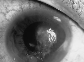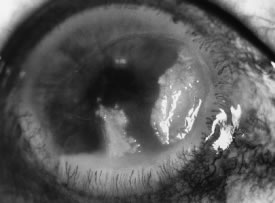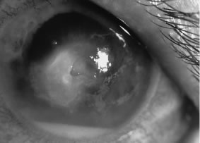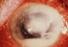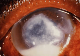 Advanced, severe filamentous fungal or yeast keratitis is indistinguishable from keratitis caused by virulent bacteria such as Staphylococcus aureus or Pseudomonas aeruginosa. The area of epithelial and stromal ulceration is large. Dense, opaque, homogenous, yellow-white stromal necrosis develop and is surrounded by confluent cellular infiltrate and full-thickness stromal edema (Figs. 19, 20, 21). Hyphal elements may penetrate Descemet's membrane and endothelium and be visualized in the anterior chamber. Fibrinous material accumulates over the endothelium, anterior chamber angle, and iris. Pain is typically severe. Secondary ocular hypertension may ensue. Progressive stromal necrosis leads to corneal perforation and, rarely, consecutive endophthalmitis.