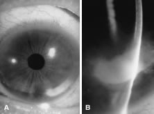 Other stains should be used if a fluorescent microscope is not available. The Gram stain does not stain the cell wall or septa of hyphal fragments but is absorbed by the protoplasm. The stain characteristics are inconsistent and nonspecific (Fig. 24). Yeasts typically stain dark blue and can be readily distinguished from bacteria, foreign material, precipitate, and other artifacts. The Giemsa stain is a simple, rapid method for identifying fungal elements, although not as sensitive as acridine orange or calcofluor white in detecting hyphal fragments and yeasts. The Giemsa stain has an affinity for DNA and ribonucleic acid (RNA) in microorganisms. The stain must be prepared fresh daily according to standards. The preferred method is to fix the smear in 95% methanol for 5 to 10 minutes, immerse the slide in Giemsa stain for 1 hour, rinse the slide briefly in 95% ethanol, blot dry, and examine by standard light microscopy. Hyphal fragments and yeasts appear dark blue or purple. Fungal elements may also be identified by standard light microscopy in direct smears by trichrome, Gomori's methenamine silver, and periodic acid-Schiff stains, although these techniques require 1 to 2 hours. A saline or potassium hydroxide wet mount is a simple, rapid technique.10,39 Polymerase chain reaction may be further developed as a practical and sensitive method of detecting fungi in corneal material.14,40,41 Most fungi responsible for keratitis generally appear on solid media or in liquid media within 2 to 5 days after inoculation. Solid media should be examined daily by direct illumination and a dissecting microscope. All media should be kept for a minimum of 21 days because of the slow growth of certain organisms. Filamentous fungi and yeasts are identified according to standard procedures. Speciation may be helpful in predicting the severity of keratitis, such as F. solani or C. albicans, but often requires consultation with a diagnostic mycologist or reference laboratory. Corneal material is difficult to obtain with a Kimura's spatula if the epithelium is intact or if the locus of infection is deep within the corneal stroma. The preferred method is corneal biopsy with the aid of topical anesthesia (proparacaine hydrochloride 0.5%) and slit lamp biomicroscopy. A simple method is to incise the cornea to the approximate depth of the suppuration with a disposable 2- or 3-mm punch trephine Baker's biopsy punch*, deepen the incision with an unguarded diamond or metal blade, grasp the tissue with a 0.12-mm forceps, and excise with straight or angled small (Vannas) scissors. The fragment should be placed into trypticase soy broth or saline without preservative for transportation to the microbiology laboratory. The fragment is emulsified and inoculated on the same media as used for corneal scrapings (see Table 2). Smears are prepared directly from the suspension. A second biopsy specimen should be submitted to the pathology for histologic sections. Corneal fragments can also be excised with blade or scissors and inoculated directly on media and emulsified for smears. Corneal tissue obtained by superficial keratectomy or penetrating keratoplasty should be bisected by the surgeon. One half should be submitted to the microbiology laboratory and one half for histologic section. *Baker Cummins, Miami, FL. Keratocentesis is reserved for suspected extension of organisms into the anterior chamber from deep stromal suppuration that cannot be sampled by corneal scraping or biopsy. |