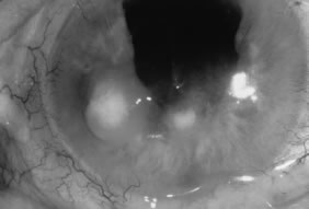 Keratitis caused by Nocardia, nontuberculous Mycobacterium, and other low-virulence bacteria resembles filamentous fungal keratitis by the presence of intact epithelium, multiple stromal infiltrates, and minimal inflammation in the adjacent stroma. Candida infection typically produces epithelial ulceration, focal necrotizing stromal inflammation, moderate cellular infiltrate and edema in the adjacent stroma, and mild or moderate iritis in the early stages, indistinguishable from bacterial keratitis (Figs. 15, 16, and 17). Fungal elements cannot be detected by biomicroscopy. If untreated, the keratitis evolves to produce dense suppuration and necrosis of the deep stroma. Although multifocal suppuration may develop in polymicrobial keratitis, there is no distinctive sign of mixed Candida and bacterial infection (Fig. 18).