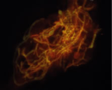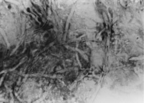 Calcofluor white is a fabric whitener used in the textile industry. The material absorbs ultraviolet light at 340 to 400 nm and emits a blue light. Calcofluor white has an affinity for cellulose and chitin, which are common compounds of hyphal fragments and yeasts.37,38 The preferred procedure is to fix the smear in 95% methanol for 5 to 10 minutes, apply calcofluor white stain (number 17353)* to the surface of the slide, apply a coverslip over the slide, drain excessive fluid with an absorbent towel, and examine by fluorescent microscopy. Depending on the selection of filters, fungal elements stain apple green to steel gray against a rust or red background (Fig. 23). *Polysciences, Warrington, PA.