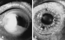 times more frequently in fungal keratitis (14 of 59) than bacterial keratitis (13 of 376).69 To assess the effectiveness of medical therapy and determine the requirement for surgical intervention, a careful, detailed corneal drawing should be made and the area, depth, and density of the stromal suppuration should be frequently quantitated. The extent of progression of suppuration into the deep stroma is difficult to judge in the presence of an endothelial plaque or fibrinous exudate in the anterior chamber. Abrupt withdrawal of topical corticosteroids produces increased stromal and anterior chamber inflammation, which are difficult to distinguish from signs of progressive invasion of replicating organisms. Imminent perforation is suggested by reduction in the density of the stromal suppuration and improved visualization of the anterior segment secondary to loss of stromal substance. Small corneal perforations (less than 2 mm in diameter) occurring early in the course of medical therapy should be managed by either a therapeutic soft contact lens or tissue adhesive. These measures prolong antifungal therapy and reduce intraocular inflammation, thereby allowing penetrating keratoplasty to be performed under more ideal conditions. Application of a tissue adhesive prevents full visualization of the area of stromal suppuration and may create a partial barrier to penetration of effective antifungal agents. A trial of a soft therapeutic contact lens may effectively seal the perforation and promote restoration of the anterior chamber. The principles are to use a tight-fitting lens, continue cycloplegic-mydriatic drops (atropine 1% or hyoscine 0.25%), and avoid external pressure on the globe. A Fox shield should be used. If the anterior chamber can be restored and maintained, medical therapy should be continued. Control of fungal replication may permit stromal healing and eliminate urgent penetrating keratoplasty. In larger perforations (greater than 3 mm in diameter) or if a soft therapeutic contact lens alone fails to maintain the anterior chamber, tissue adhesive should be applied. In the presence of large areas of stromal thinning and necrosis, the likelihood of corneal perforation should be anticipated and penetrating keratoplasty performed urgently. The goals of therapeutic penetrating keratoplasty are to restore the structure of the cornea, maintain the anterior chamber, and eliminate replicating organisms. In phakic eyes, an additional goal is to preserve the integrity of the lens and avoid additional intraoperative procedures that may enhance the spread of organisms into the vitreous to produce consecutive fungal endophthalmitis. In eyes without impending or extant perforation, akinesia and anesthesia may be accomplished by standard lid and retrobulbar block. General anesthesia, possibly supplemented by direct infiltration of extraocular muscles, is preferred in the presence of corneal perforation. Cycloplegic-mydriatic drops should be discontinued 24 to 48 hours before surgery to facilitate protective miosis. A carbonic anhydrase inhibitor (e.g., acetazolamide, 500 mg, oral or intravenous) and intravenous mannitol (1 g/kg) should be administered. Although the decision on the size and placement of graft must be made at surgery, careful preoperative slit lamp biomicroscopy is helpful to determine the requirement for donor tissue. The trephination should provide a margin of 1 to 1.5 mm around the area of suppuration to eliminate the replicating organisms. The exact extent of organisms within the stroma adjacent to the area of suppuration cannot be accurately determined by slit lamp biomicroscopy. If the required donor cornea is estimated to be less than 12 mm, use of corneal-scleral tissue stored in standard medium is preferred and the eye bank should be advised of the need for tissue with an adequately large scleral rim. If a larger graft is required, a whole globe is preferred to simplify excision of the donor tissue. In an intact globe, external pressure should be applied by a balloon device or hand compression to soften the eye and reduce the orbital contents. The Schott speculum* is ideal to support the eyelids, expose the globe, and minimize extrinsic pressure. A partial or 360-degree peritomy should be done if the anticipated graft-host junction requires placement of corneal sutures outside the limbus. A scleral support ring should be sutured 3 to 4 mm posterior and concentric to the limbus. To facilitate vitreous aspiration if required to reform the anterior chamber, a partial-thickness sclerotomy incision should be made 3.5-mm posterior to the limbus in the inferotemporal quadrant and partially closed with a horizontal mattress suture. *International Instruments, Weston, MA. The size and placement of the graft are determined by the location and area of the stromal suppuration. The goal is to center the trephination with reference to the cornea rather than to the site of suppuration. If the area of suppuration is large and extends asymmetrically, decentration of the trephination may be required to obtain an adequate margin adjacent to the limbus (Fig. 26). If the suppuration is located in the peripheral cornea, a small, decentered graft may be preferred to provide a free margin of replicating organisms and avoid the complications of a large graft, despite the necessity of placement of the graft-host junction within the optical zone (Fig. 27). Circular trephinations are preferred; free-hand, half-circle, or annular grafts are technically difficult and unnecessary. If suppuration and necrosis extend beyond the limbus, a large 10- or 11-mm graft is required. The size of the trephination is best determined in an intact globe. In corneal perforation, intraoperative application of tissue adhesive permits reformation of the anterior chamber through a corneal stab incision. The donor cornea should be oversized at least 0.25 mm in phakic eyes and 0.5 mm or 1.0 mm in phakic eyes for trephinat