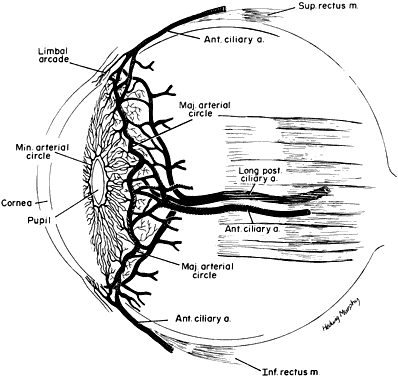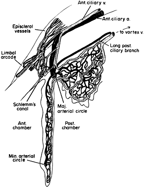 ciliary body, and the choroid. The primary function of the uveal tract is to supply nutrition to the eye (Fig. 2), both in health and in disease. Clinically, the uveal tract mirrors vascular diseases. Inflammation in the uveal tract, or uveitis (e.g., iritis, cyclitis, choroiditis), reflects local and systemic noxious agents. Degenerations in the uveal tract are often due to vasculopathies such as arteriosclerosis, diabetes mellitus, and autoimmune diseases. Essentially vascular, the uveal tract provides sustenance for the retinal rods and cones through the choriocapillaris and for the lens through the aqueous. In addition, the muscles of the iris and the ciliary body (by, respectively, controlling pupillary size and altering the accommodation of the lens) assist in the refractive action of the eye. Contraction of the longitudinal portion of the ciliary muscle (Brucke's muscle), attached anteriorly to the trabecular fibers, may affect aqueous outflow and glaucoma.