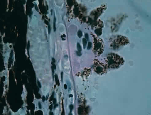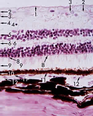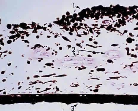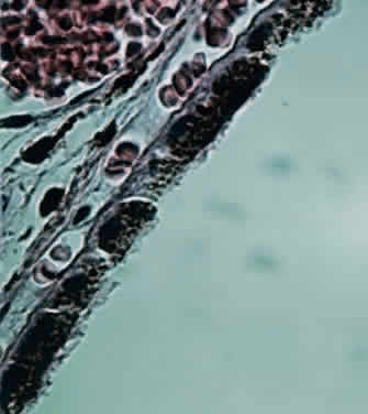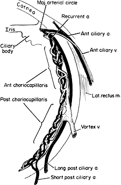 during photocoagulation of neovascular membranes. During angiography, fluorescein dye is carried to the choriocapillaris from the larger vessels. Because the choriocapillaris leaks fluorescein easily, the dye diffuses rapidly throughout the choroid but cannot pass anteriorly into the retina because of the tight junctions between the RPE cells. Thus, clinically during an early phase of angiography, a shaded diffuse glow of fluorescein appears in the choroid as a result of the opaque RPE. If defects occur in the RPE (e.g., drusen, serous detachment), fluorescein can leak into the retina from the choroid. With the increasing incidence of age-related macular retinal degeneration, more attention is being directed to the subfoveal choroidal anatomy and changes in disease. Photodynamic therapy with verteporfin IV dye and laser treatment may help to prevent visual loss secondary to subfoveal choroidal neovascularization. New research into medication to inhibit vascular endothelial growth factor offers potential treatment for the future. The retinal vessels, in contrast to the choroidal vessels, do not leak fluorescein normally. At the optic disc, the choroidal vessels also leak fluorescein, so the perimeter of the disc “lights up” in the late phase of angiography even though the disc vessels proper do not normally leak fluorescein. The primary function of the choroid is to supply nutrition to the rod and cone layer of the retina. Because of the erectile potential of the vascular channels, the choroid may also have a role in regulating intraocular pressure and in acting as a heat diffuser to protect the photoreceptors from the heating effect of absorbed light, particularly at the macula. At the optic disc, the choroidal circulation joins with the short posterior ciliary vessels and the branches from the central retinal artery to supply nutrition to the optic nerve. As a feature of glaucoma, choroidal peripapillary atrophy is a frequent hallmark. Embryologically, the choroid is derived from the mesoderm that surrounds the posterior portion of the primitive cup. The choroidal bond of Bruch's membrane to the pigmented epithelium of the retina is strong, so in “true” retinal detachments the line of cleavage is between the rod and cone layer and the pigmented epithelium. MACROSCOPIC FEATURES Grossly, the choroid represents a vascular bed formed by the junction of the anterior and posterior ciliary arteries (Fig. 16). The ciliary arteries (2 long posterior arteries, 20 short posterior arteries, and posterior communications of the anterior ciliary arteries) pierce the sclera to reach the choroid. They divide into vessels of gradually smaller caliber and end as choriocapillaris, nestled adjacent to Bruch's membrane. Thus, the choroid is an expandable vascular plexus that supplies nutrition for the rod and cone layer of the retina and up to 130 mm of the outer retina, particularly the macula. Thus, choroidal vascular changes due to inflammation or degeneration lead eventually to retinal pathology (e.g., subretinal neovascularization). The venous drainage from the choroid is through the four vortex veins, one in each quadrant of the posterior sclera (Fig. 17). In choroidal detachment, the vortex veins still adhere to the sclera, inducing loculations or grapelike mounds of fluid compartments in the edematous choroid. MICROSCOPIC FEATURES The choroid may be classified in layers, from the external to the internal surface. The suprachoroid is the space between the inner pigmented sclera (lamina fusca) and the large vessels of the choroid. The large-vessel layer (Haller's layer) is the outermost layer of the choroid. It is characterized by wide-caliber veins and arteries. Many melanocytes and ciliary nerve fibers are scattered throughout the vessel layers. The melanocytes and the Schwann cells encasing the nerve fibers, along with an occasional cluster of nevus cells, may be the precursors of the dreaded malignant melanoma of the choroid. The medium-vessel layer (Sattler's layer) is composed of medium-sized blood vessels and is located in the center of the choroid. The choriocapillaris is a layer of very large fenestrated capillaries (40 to 60 μm in diameter) lying in a single plane external to Bruch's membrane (Fig. 18; no fenestration of the choriocapillaris is visible at this level of magnification). The capillary lumina are large enough to pass several red blood cells simultaneously (Fig. 19). Unlike the larger vessels in the choroid, the fenestrated choriocapillaris lacks an internal elastic lamina and therefore leaks fluorescein during clinical angiography. Pericytes are found on the outer wall of the capillaries. Postmortem injection studies suggest that the choriocapillaris is continuous, but the choriocapillaris functions clinically like an end arteriole network. At the posterior pole, the choriocapillaris has a lobular pattern with a central precapillary arteriole and a peripheral postcapillary venule.
