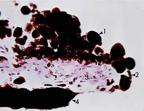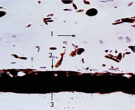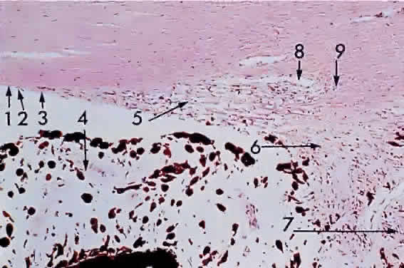 MICROSCOPIC FEATURES The iris forms the posterior boundary of the anterior chamber angle (Fig. 4). The thin iris root is continuous with the pectinate ligaments of the trabecular meshwork. The surface of the anterior iris is irregular, with furrows and crypts. The pupillary zone is located between the collarette and the pupillary ruff. The remainder of the iris is called the ciliary zone. The fringed iris collarette is located approximately 2 mm from the pupillary border. The major arterial circle is located in the ciliary body, to which the thin iris base is attached (Fig. 5). Blunt trauma to the globe often tears the iris at its thin base (iridodialysis), and hemorrhage leaks into the anterior chamber (hyphema). The major arterial circle is formed by the junction of the long posterior ciliary arteries and the anterior ciliary arteries extending from the insertions of the extraocular rectus muscles. Two anterior ciliary artery branches extend from each rectus muscle scleral insertion at the level of the ora serrata, except for the lateral rectus muscle, which sends only one branch. Therefore, during extraocular muscle surgery, care should be taken not to sever more than three rectus muscles during one operation to avoid anterior segment ischemia. Tributaries from the major circle are sent radially to the lesser arterial circle at the iris collarette (Fig. 6). The iris crypts are tiny caverns located between the vascular radiations, and they lead into the stroma. The iris contraction furrows are concentric with the periphery of the ciliary zone. They become prominent when the pupil dilates, thus permitting the telescoping effect during mydriasis. Although the iris has no definite anterior endothelial membrane, an irregular arrangement of stroma is condensed to form the anterior border layer. The iris stroma features pigment cells and clump cells interspersed between the blood vessels. The walls of the blood vessels are relatively thick, so that dilation or contraction of the pupil does not impair blood flow. The tight endothelial cell attachments may explain the relatively low permeability of normal iris vessels during angiography. The blood vessels are masked by the stromal pigment in brown irides but are often easily seen by biomicroscopy in blue irides. The sphincter muscle of the iris is a circular band of interwoven fibers surrounding the pupil (Fig. 7). It is innervated by the ciliary nerves (parasympathetic nerve fibers). The sphincter muscle is so constructed that even if part of the sphincter is cut or excised, the remaining fibers can still contract or relax. The dilator muscle of the iris is a long, thin band of radially arranged fibers lying just anterior to the pigmented epithelium (Fig. 8). The dilator fibers have cell bodies that are small and round, with long cytoplasmic extensions stretching out anteriorly. The fibers of the dilator muscles of the iris are innervated by the sympathetic nervous system, and stimulation causes mydriasis. The cell bodies of the dilator muscles are cuboidal, heavily pigmented, and closely adherent apex to apex to the cells of the posterior layer of iris pigmented epithelium. The pigmented epithelium of the iris is a lamina of heavily pigmented columnar cells; it lines the posterior surface from the pupillary ruff to the ciliary body. The pigmentation of this layer is so dense that the cell nucleus usually cannot be seen unless the microscopic sections of the iris are cut very thin or bleached (Fig. 9).