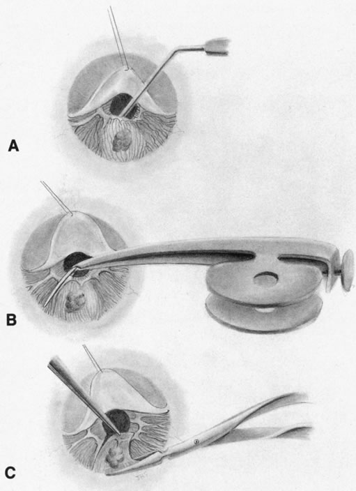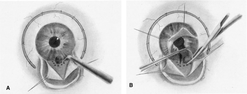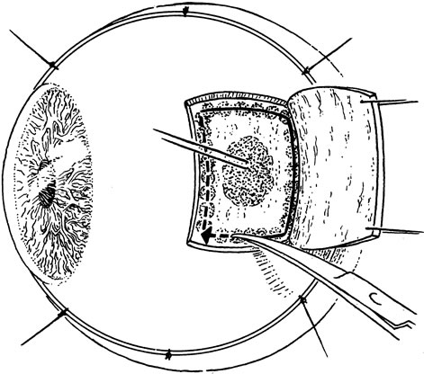 T Incision of Stallard The T incision of Stallard allows larger tumor exposure and excision. A conjunctival flap is opened to expose bare sclera and a Flieringa ring is fixed through episcleral sutures. A T-shaped limbal-scleral incision is then made with a knife and extended with the corneoscleral scissors. Closing sutures may be preplaced. The ciliary body surrounding the lesion is treated with penetrating diathermy (Fig. 5A). With the cornea and scleral flaps reflected, the pupillary margin is grasped and the iris incised radially to the iris root (Fig. 5B). The involved portion is excised with scissors.49,50 Modifications of this technique, such as eliminating the Flieringa ring or including cataract removal, may be made as necessary. Müller45 described a technique using a trephine to replace the overlying corneoscleral tissue over the tumor prior to dissecting the sclera (Fig. 5C). Its advantage is that there is less likelihood of disturbing the tumor mass while excising the tumor (Fig. 5D). Iridocyclochoroidectomy of Peyman Iridocyclochoroidectomy of Peyman allows large tumor removal when there is more choroidal involvement posteriorly. After transillumination, localization, and marking on the bare sclera, a Peyman C-shaped cyclectomy basket is sutured in place (Fig. 6A). The scleral flap is fashioned depending on the location of the tumor. A limbal-based scleral flap can be raised with tumors located anteriorly not involving the retina. However, with more posteriorly located tumors that involve the retina, the scleral flap is started at the limbus and dissected posteriorly. A partial-thickness scleral flap is dissected and penetrating diathermy performed around the tumor margins outlined by transillumination (Fig. 6B). The tumor is excised with scissors, using radial iris incisions extending along the diathermy margins (Fig. 6C). The crystalline lens is removed with vitrectomy instruments, cutting all zonular attachments. After suturing the sclera in place with fine nonresorbing sutures (Fig. 6D), a vitrectomy is completed through an opening in the wound, or preferably using a standard pars plana approach. Ocular volume is replaced by intravitreal gas or silicone oil injection. Endolaser retinopexy is used to augment diathermy more posteriorly around the tumor base to ensure chorioretinal adhesion.