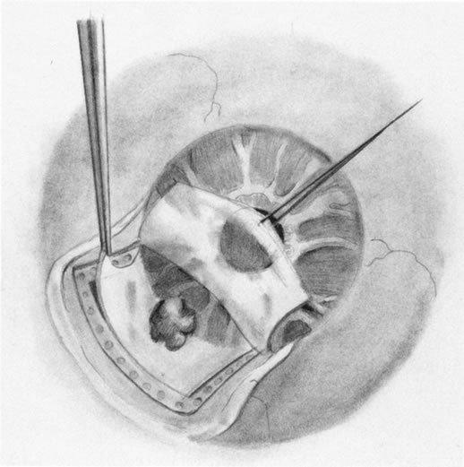 For anterior segment fine-needle aspiration biopsy, the needle is inserted from the opposite side of the mass under direct visualization of the surgical microscope.57 For posterior segment lesions, the transvitreal approach is used, initially making a small partial-thickness 1.5 mm–long sclerotomy with a no. 57 Beaver blade. Only the 25-gauge needle passes through the remaining sclera. Subsequently, the wound is closed with 6-0 or 7-0 Vicryl sutures. Seeding of tumor cells along the needle tract is thought to be reduced by the transvitreal approach because of the sweeping action of the vitreous.4 Tumor cell seeding along the scleral needle tract has been reported with retinoblastoma and has been identified in needle tracts of aspiration biopsy in the enucleated eye harboring melanoma.58 The transvitreal approach also allows deep penetration of the tumor by the needle through the overlying retina. This, however, increases the risk of rhegmatogenous retinal detachment (see Fig. 9). Char and Miller59 demonstrated in a retrospective study that fine-needle aspiration biopsy was useful in identifying 9% of lesions that had been presumed to be uveal melanoma on noninvasive testing. They concluded that noninvasive testing was not as accurate as fine-needle aspiration biopsy for smaller lesions. Cohen and colleagues60 demonstrated that fine-needle aspiration biopsy had a diagnostic accuracy of 98% for choroidal lesions 4 mm or greater in height, but only 40% for lesions less than 1.99 mm. INDICATIONS FOR CHOROIDECTOMY Careful documentation of tumor growth is important before treating small tumors. Diagnostic biopsy is usually reserved for difficult clinical settings in which the diagnosis is in question. A complete diagnostic evaluation, including serial photography, ultrasonography (A-scan and B-scan), magnetic resonance imaging, and intravenous fluorescein angiography should be undertaken. The maximum size of tumor that can be resected has not been determined. Large choroidal and ciliary body tumors have been resected; if the tumor is located anteriorly and has greater height and a narrow choroidal base, it is easier to remove. Tumors of up to 17 mm have been resected by Peyman.61,62 Lesions closer to the fovea or the optic nerve may have poor visual and anatomic results if removed by external resection. Postoperative hypotony may be prevented by the use of intravitreal silicone oil and silicone gels.63 Lesions closer than 4 disc diameters to the disc are difficult to remove without significant trauma and may represent cases best approached by an internal resection method.17,64–66 Tumor location within 1 diameter of the optic disc or fovea is significantly associated with local tumor recurrence following choroidectomy.48 The risk of retinal detachment has been reported to range from 9% to 18% following choroidectomy.67,68 TECHNIQUES OF CHOROIDECTOMY Trapdoor Approach of Stallard After a conjunctival peritomy, a Flieringa ring is sutured to the bare sclera. A lamellar-scleral flap (50% to 80% thickness) is dissected in a trapdoor fashion over the tumor area. Penetrating diathermy is applied around the lesion with adequate margins. The lesion is excised with scissors (Fig. 12), leaving the retina intact.