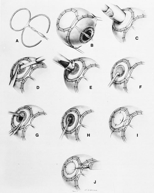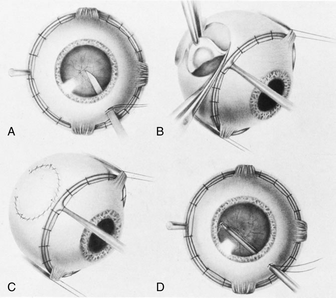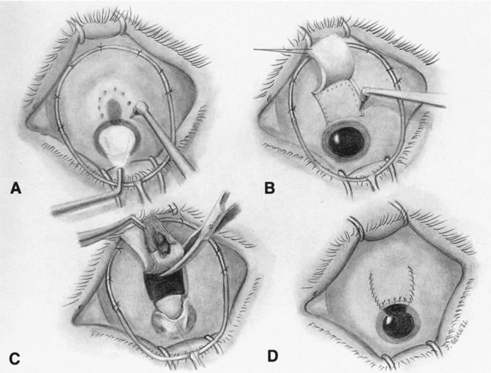 Full-Thickness Eye Wall Resection of Peyman Preoperatively, the mass lesion is surrounded by rows of heavy photocoagulation, which is performed in two sessions 3 to 4 weeks apart.69–75 The resection is performed 4 weeks after the final session.73 A conjunctival 360-degree peritomy is carried out, and the tumor is localized by transillumination and diathermy. A Peyman basket is sutured to the globe. A partial-thickness scleral flap is dissected around the lesion. Penetrating diathermy is applied around the tumor in the scleral bed. A pars plana sclerotomy is performed for later vitrectomy and sealed with scleral plugs or temporally sutured (Fig. 13A). The tumor is excised with curved Vannas scissors (Fig. l3B). After the scleral flap has been sutured in place (Fig. 13C), a pars plana vitrectomy is performed to remove any vitreous blood and incarcerated vitreous from the excision site (Fig. 13D). Surgery is performed under hypotensive anesthesia to reduce the risk of hemorrhage.72