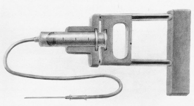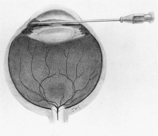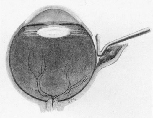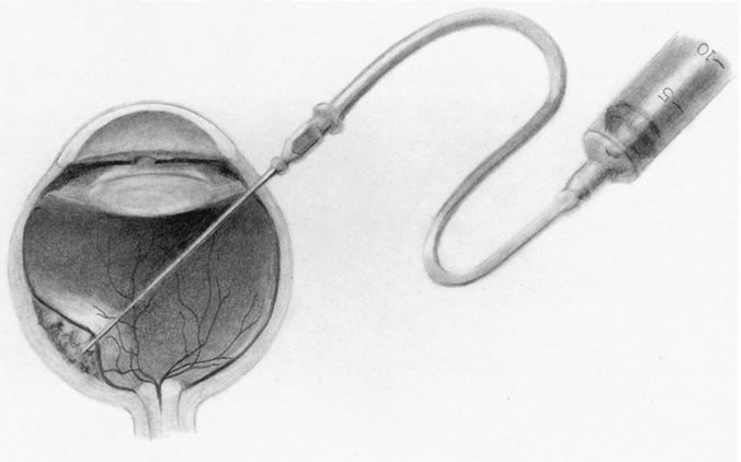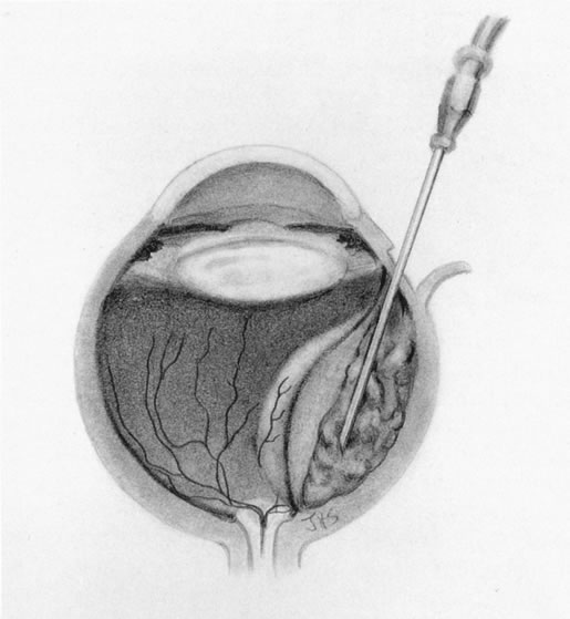 techniques and the use of biopsy techniques. FINE-NEEDLE ASPIRATION BIOPSY Ophthalmic fine-needle aspiration biopsy has developed along with the evolution of radioactive plaque therapy and more conservative surgical approaches to enucleation. Cytopathologists have achieved definitive diagnoses based on small cellular samples.54,55 The method of choice for fine-needle aspiration biopsy is contingent on the existing anatomic state of the eye, the location of the tumor, size of the tumor, and presence of retinal detachment. The anterior uveal lesion may be approached through the cornea-limbus for iris lesions (Fig. 7), or in aphakic eyes, into the more posterior ciliary body lesions (Fig. 8). In the posterior uveal lesion, either a pars plana transvitreal approach may be made (Fig. 9) or a transscleral approach may be adapted in more anterior lesions or in lesions with overlying retinal detachment (Fig. 10). Most surgeons prefer to use a 25-gauge fine needle with a flexible connector to a 10-mL aspiration syringe to minimize movement and surgical trauma during biopsy (Fig. 11). Some surgeons prefer a spinal tap needle with a trocar and cannula56; however, many surgeons use a standard long 25-gauge needle. It is felt that the excess movement caused by removing the trocar and attaching a syringe and flexible connector may lead to increased complications.